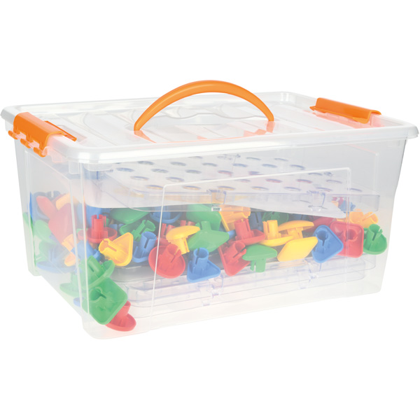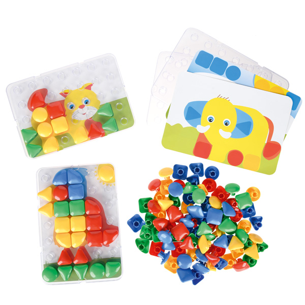 Mit bunten Steckknöpfen werden auf Grundplatten verschiedenste Muster und Bilder gesteckt - der Fantasie sind dabei keine Grenzen gesetzt. Die Kinder lernen Farben und Formen benennen und schulen ihre Fingerfertigkeit. Auch zur Arbeit nach Vorlage (beiliegend) geeignet. Die bunten Vorlagen passen perfekt unter die transparenten Steckplatten.