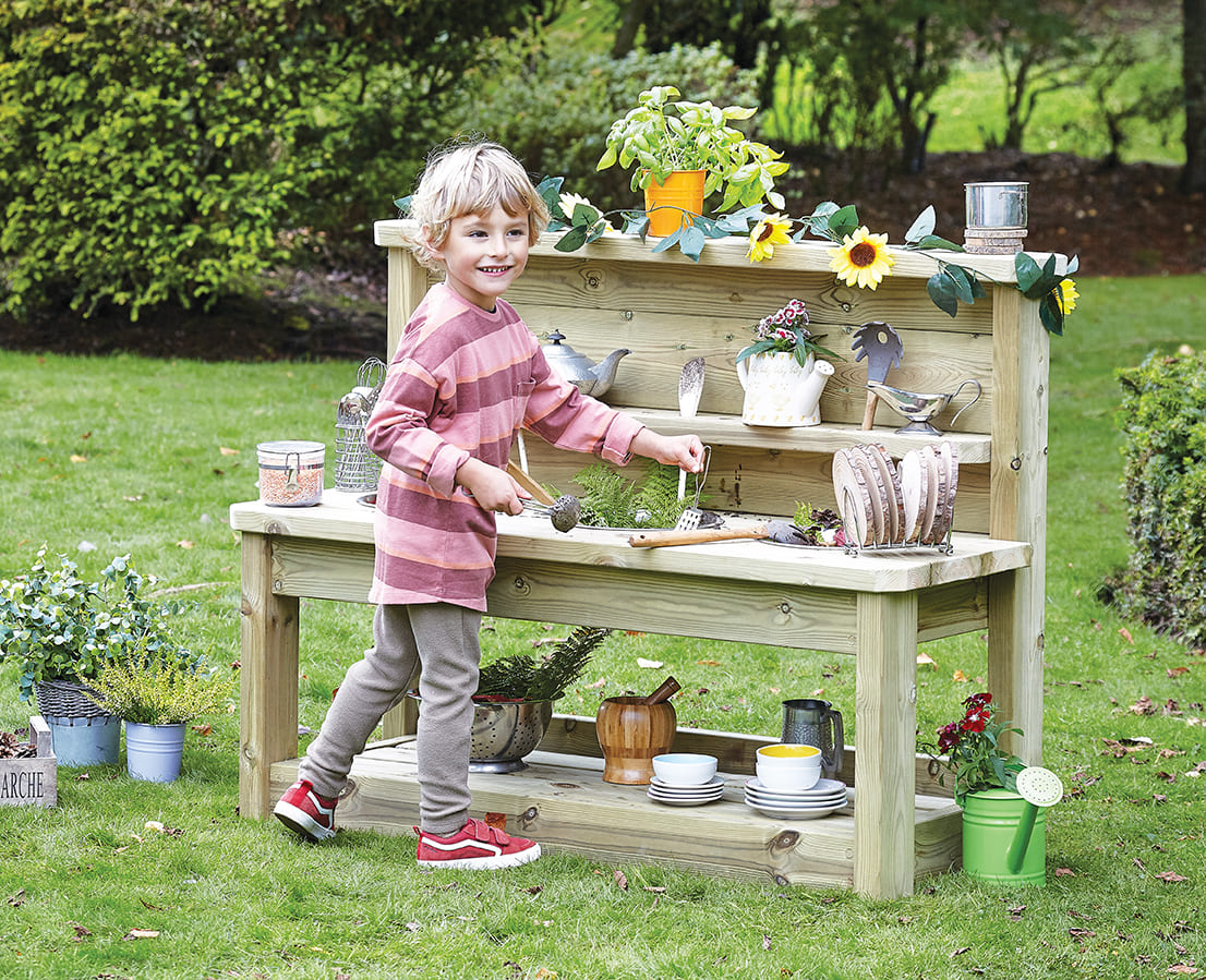 Mit 3 Spielstationen, jede mit einer herausnehmbaren Schüssel, ist die Multi-Matschküche ideal, um Kinder zum Experimentieren mit verschiedenen Materialien und Texturen anzuregen. Oberes und unteres Regal bieten reichlich Stauraum für Töpfe, Pfannen, Schüsseln und andere Utensilien.