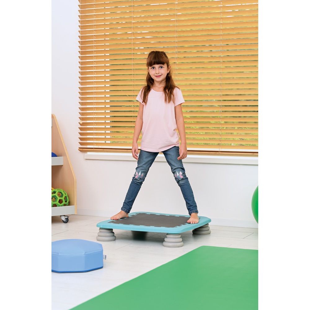 Der Stepper ähnelt einem Trampolin für den Innenbereich. Er dient dazu, die Sinne der Kinder anzuregen, Körpergefühl und Gleichgewicht zu schulen und hilft ihnen dabei, sich zu konzentrieren. Das Gerät ist aus starkem, langlebigen Material gefertigt und hat eine robuste Oberfläche, um eine hohe Stabilität zu gewährleisten. Die Ecken sind für eine sichere Nutzung abgerundet.