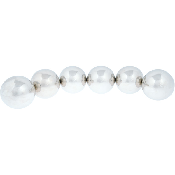 Edelstahlkugeln mit Spiegeloberfläche, die zwar gleich aussehen, sich aber unterschiedlich verhalten: Einige können nicht auf einer geraden Bahn rollen, andere machen Geräusche, wenn man sie schüttelt. Je nach Inhalt variieren Gewicht und Klang. Die spiegelnde, gebogene Oberfläche sorgt für einen faszinierenden Fischaugen-Effekt.
