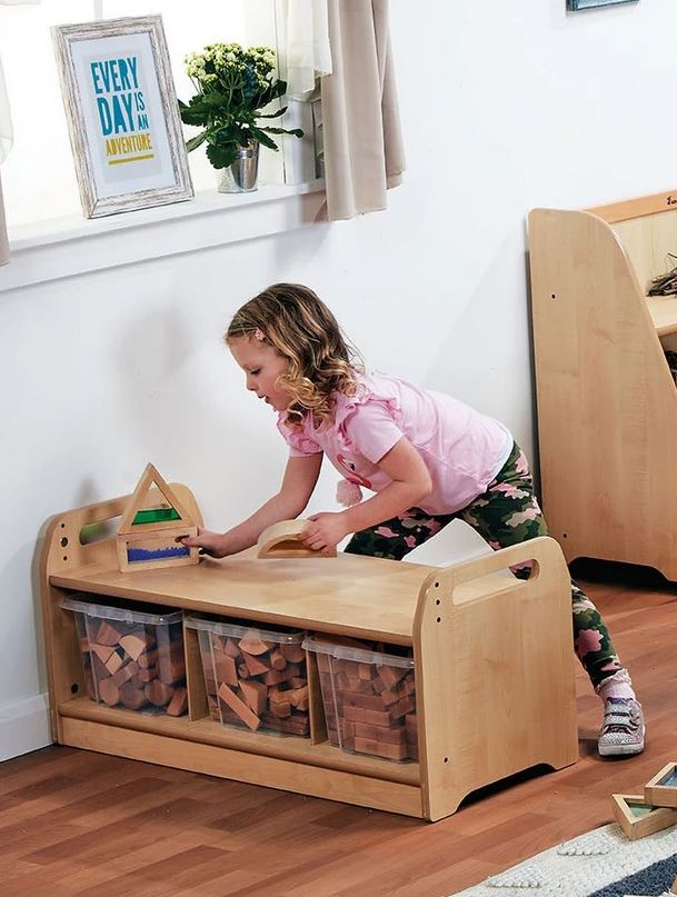 Die Bausteine bestehen aus hochwertigem, massivem Buchenholz mit abgerundeten Ecken für mehr Sicherheit. Die robuste Aufbewahrungsbank ist aus kratzfestem Melamin in Ahornoptik gefertigt und mit stabilen Buchenholzelementen versehen – langlebig, widerstandsfähig und pflegeleicht.