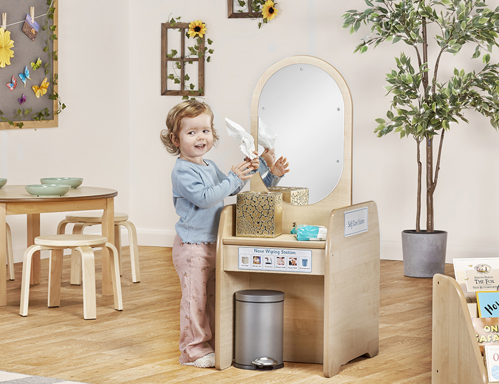 Das Natura Hygieneregal mit Spiegel unterstützt Kinder dabei, alltägliche Hygieneroutinen selbstständig zu üben. Auf einer Seite befindet sich ein praktischer Getränkebereich, auf der anderen ein Naseputzbereich – ideal für Krippe, Kita oder zu Hause.