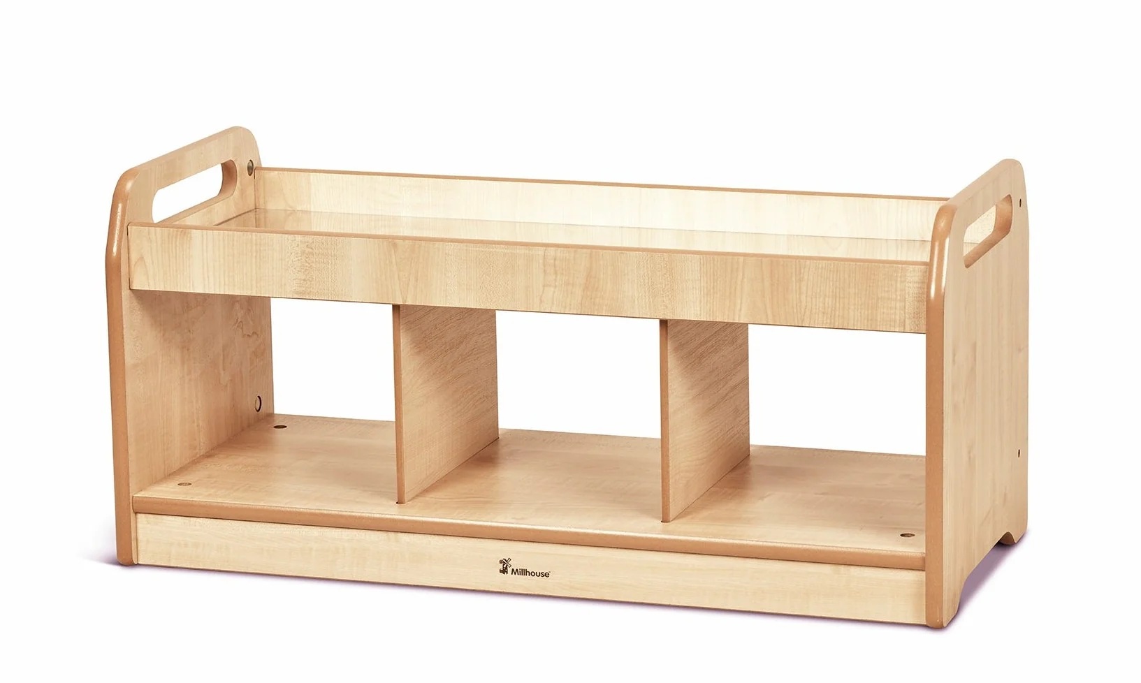 Niedriges, beidseitig zugängliches Regal mit Spiegelfläche – ideal für sensorische Spiele.
