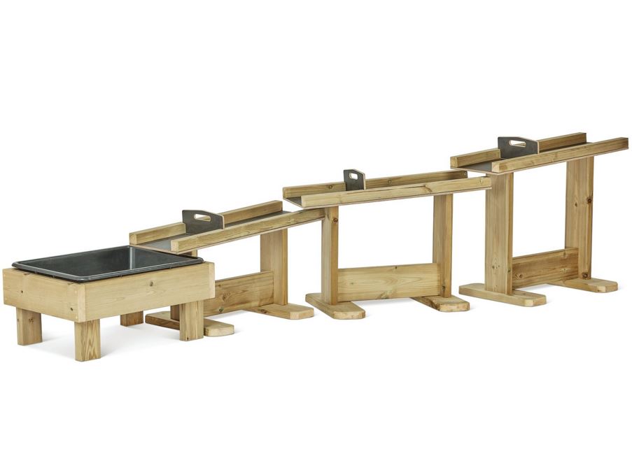 Das Set umfasst drei freistehende Wasserkanal-Elemente, die jeweils mit einer herausnehmbaren Stauklappe ausgestattet sind. Alle Elemente lassen sich flexibel neu anordnen, sodass immer wieder neue Spiel- und Lernmöglichkeiten entstehen. Die robuste Kunststoffwanne sammelt das Wasser und verfügt über einen Schraubverschluss, der das Entleeren erleichtert.