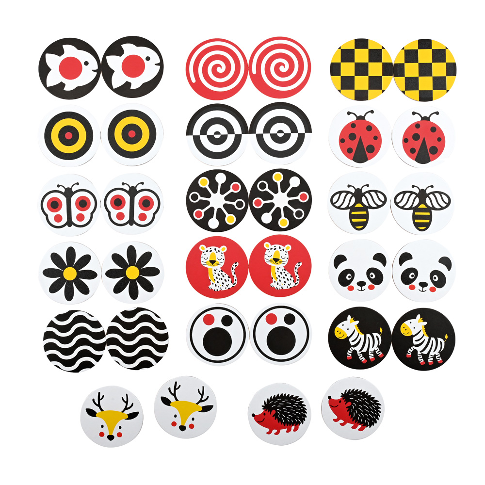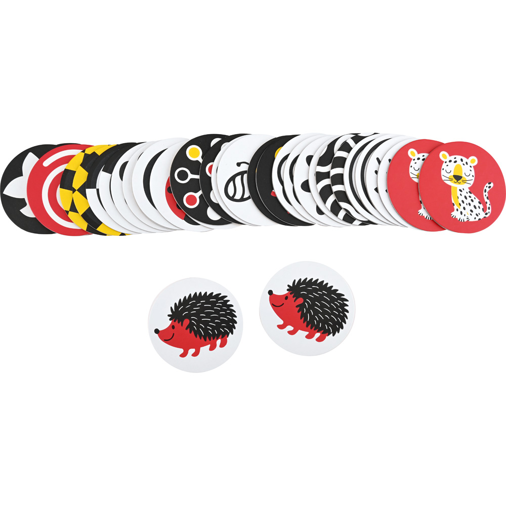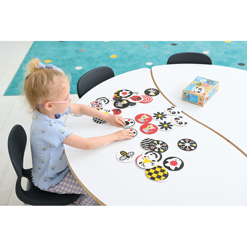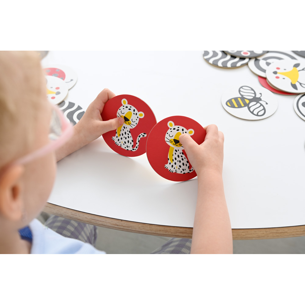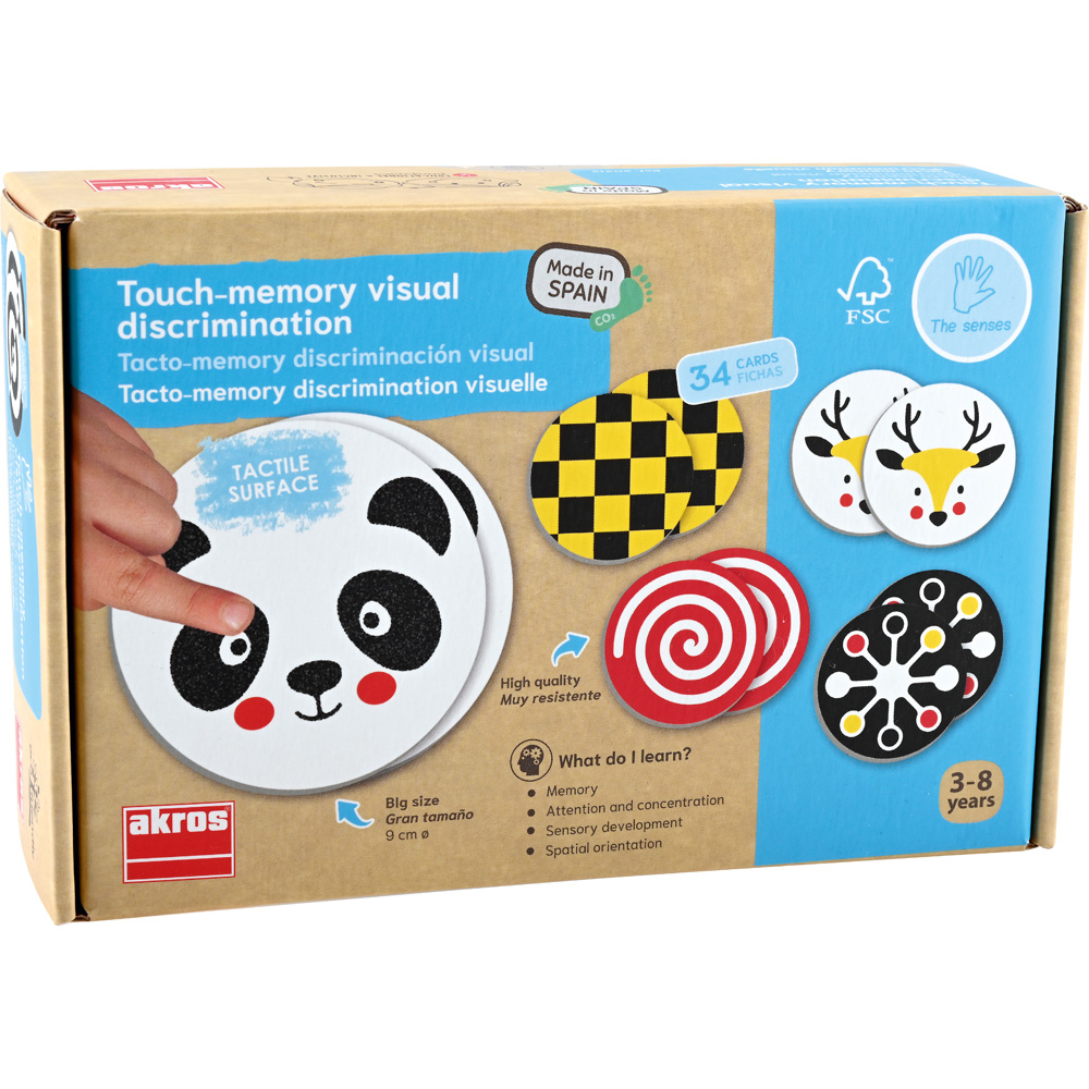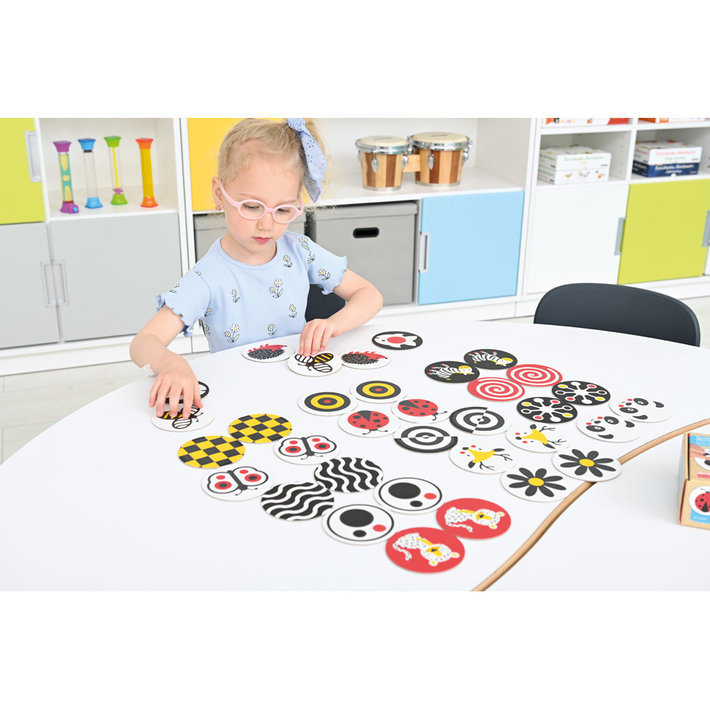 Die runden farbenfrohen Karten haben eine raue Textur. Beim Ertasten entwickeln die Kinder ein visuelles und haptisches Unterscheidungsvermögen. Die Karten eignen sich sehr gut für klassische Gedächtnisspiele oder Spiele zur Entwicklung des taktilen Gedächtnisses. Das Spiel wird für Kinder mit Sehbehinderung empfohlen.