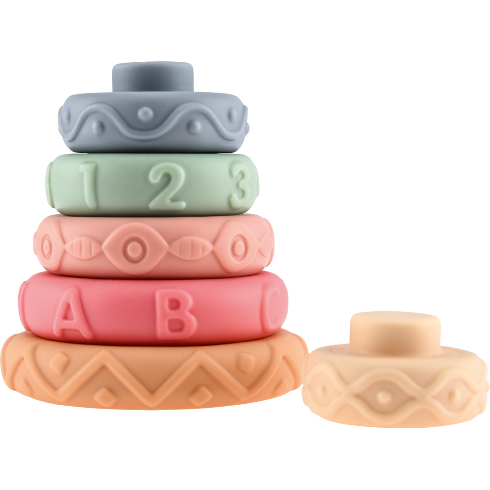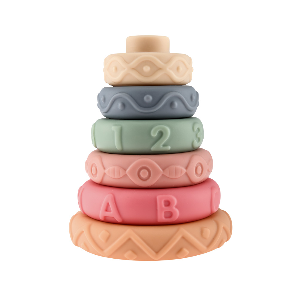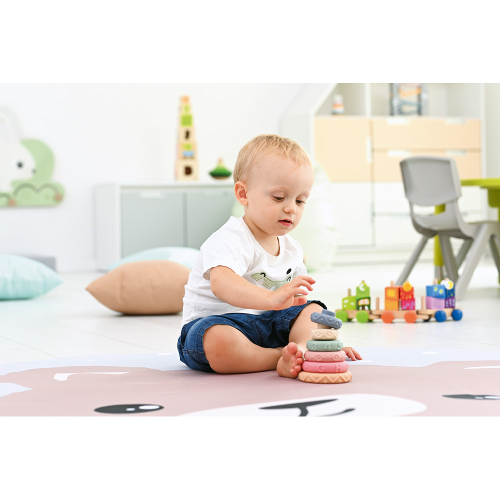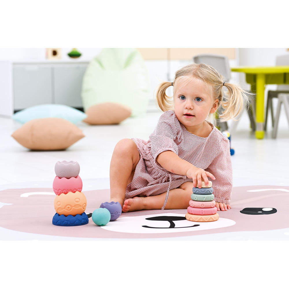 Ein Stapelturm bestehend aus 6 Teilen in weichen Pastellfarben. Jedes Element zeigt unterschiedliche Motive, so dass Kinder beim Spielen verschiedene Dinge lernen können, etwa das Zählen. Ebenso schult das Stapeln die Feinmotorik und die Auge-Hand-Koordination. Die texturierten Oberflächen stimulieren zudem den Tastsinn.