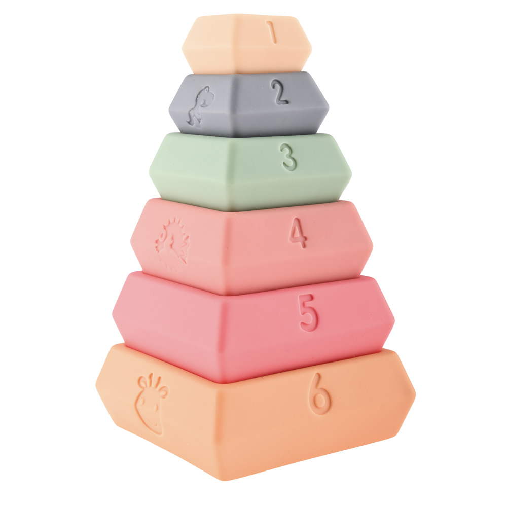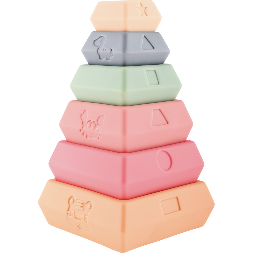 Ein Stapelturm bestehend aus 6 Teilen in weichen Pastellfarben. Jedes Element zeigt unterschiedliche Motive, so dass Kinder beim Spielen verschiedene Dinge lernen können, etwa das Zählen. Ebenso schult das Stapeln die Feinmotorik und die Auge-Hand-Koordination. Die texturierten Oberflächen stimulieren zudem den Tastsinn.