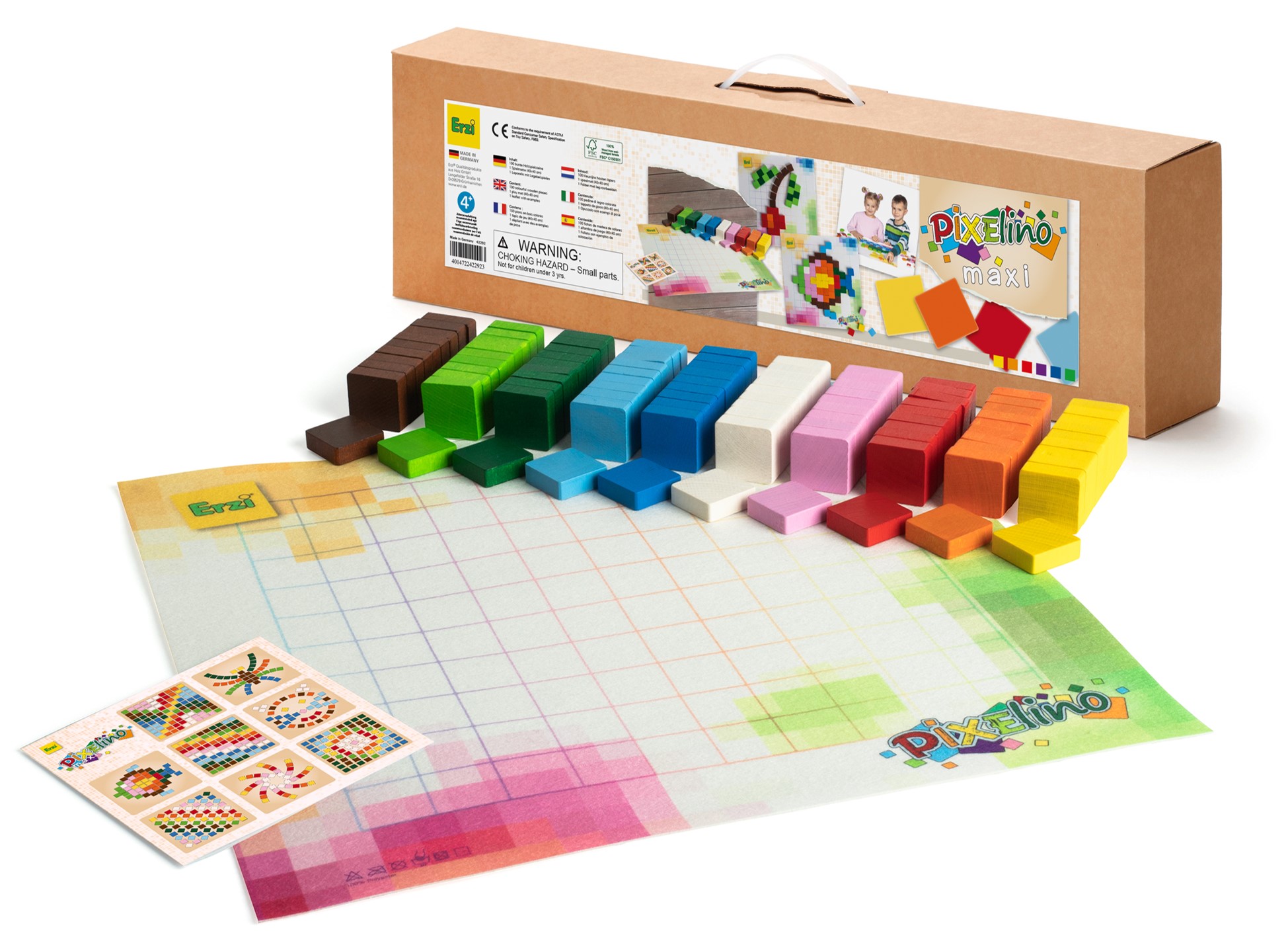 Pixelspiel Maxi zum Legen, Stapeln und Spielen auf einer bunt bedruckten Matte mit feinem Gitternetz