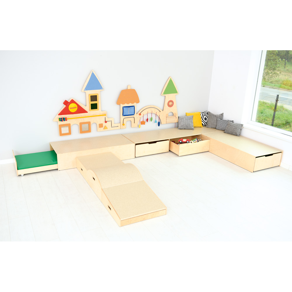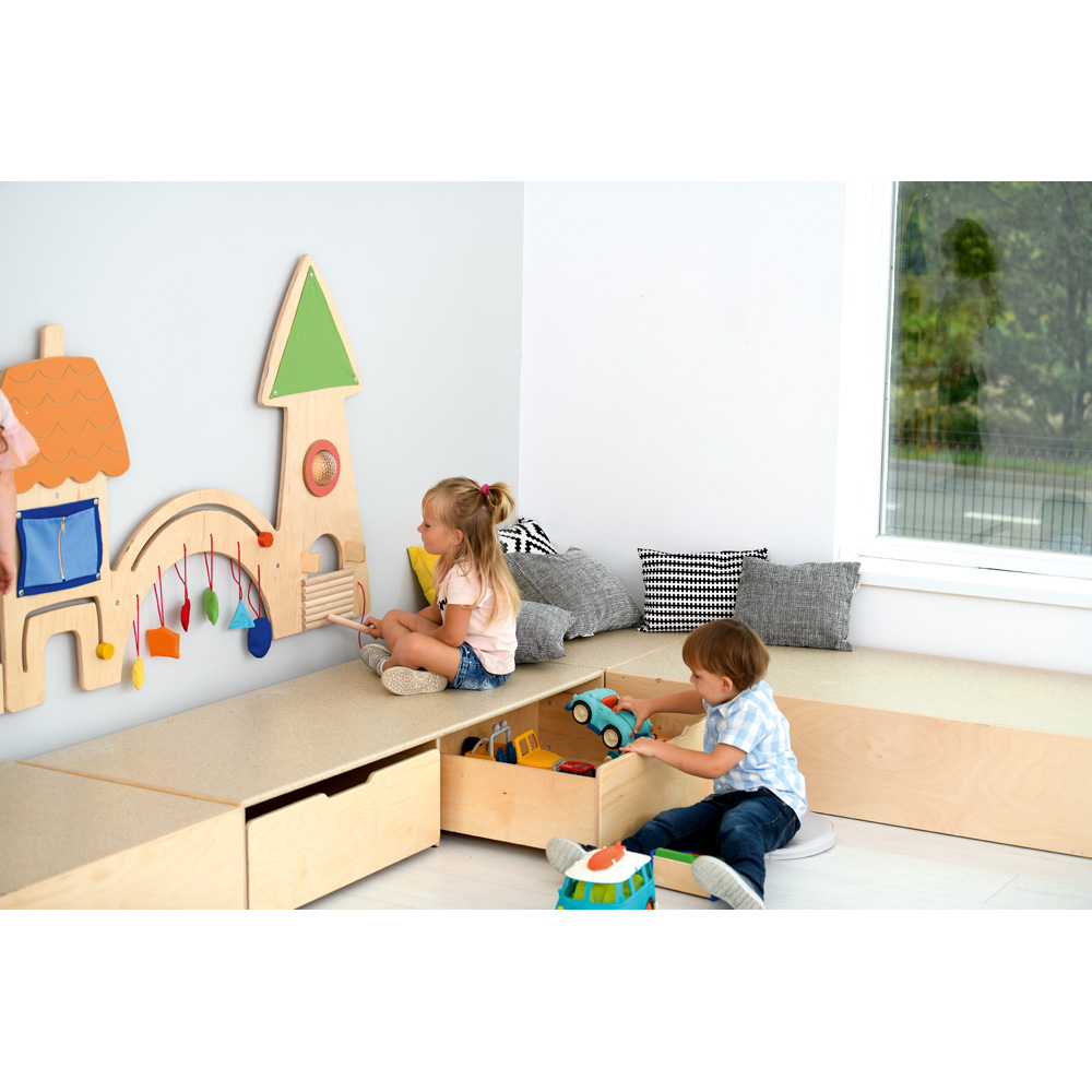 Mit den Podesten wird zusätzlicher Stauraum geschaffen. Die grossen, ausziehbaren Schübe sind sicher unter dem Podest verstaut, während darauf gespielt werden kann. Verbindungsklammern verhindern das Verrutschen zweier Podeste, sie sind nicht im Set enthalten. Schübe mit 4 versenkten Rollen (Ø 3 cm) - separat zu bestellen.