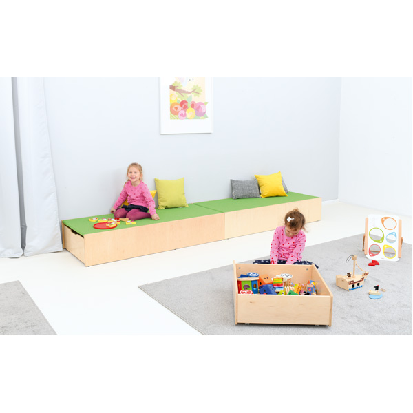Mit den Podesten wird zusätzlicher Stauraum geschaffen. Die grossen, ausziehbaren Schübe sind sicher unter dem Podest verstaut, während darauf gespielt werden kann. Verbindungsklammern verhindern das Verrutschen zweier Podeste, sie sind nicht im Set enthalten. Schübe mit 4 versenkten Rollen (Ø 3 cm) - 2er-Set 126537 oder 1 Stck. 126541 - separat zu bestellen.
