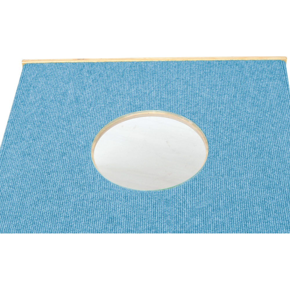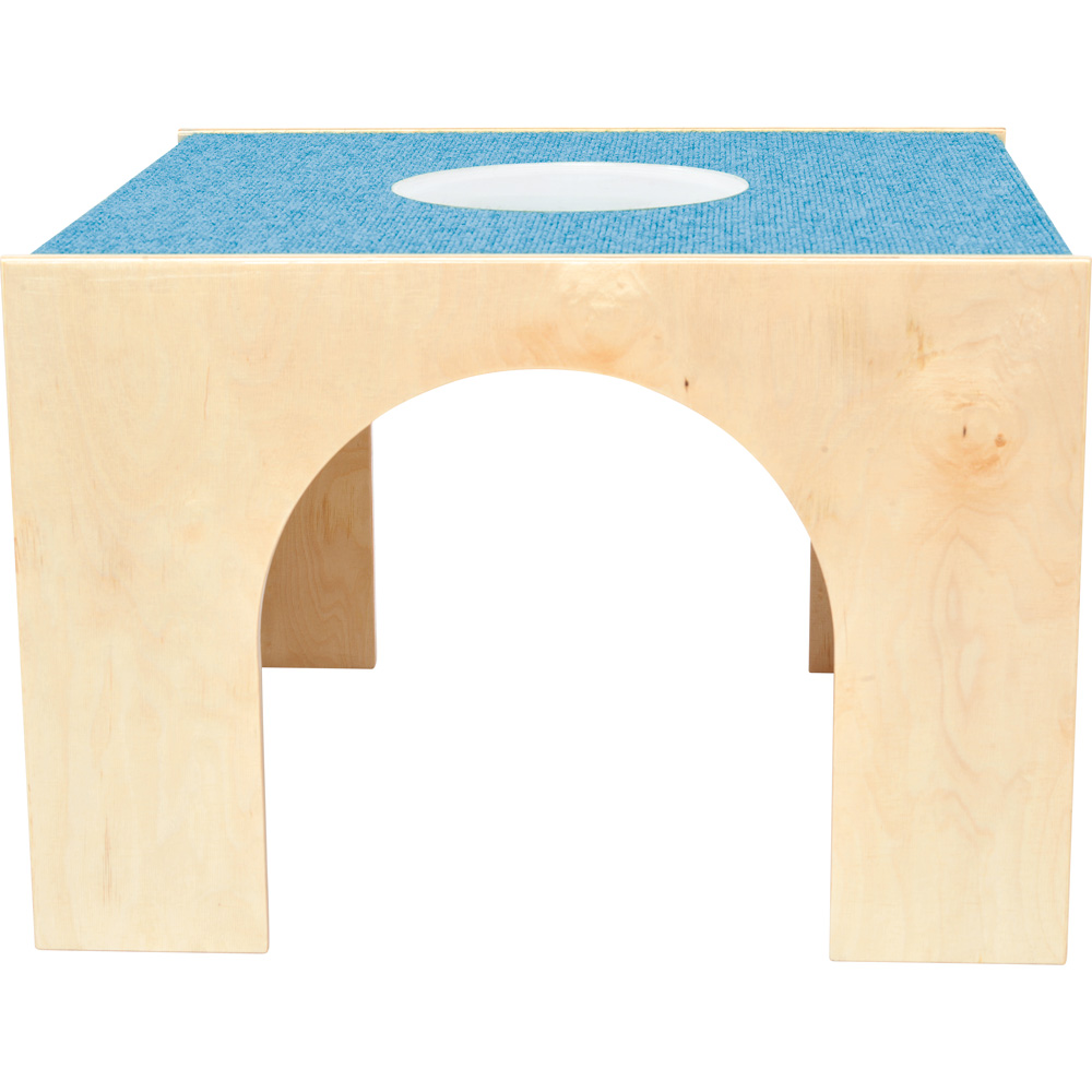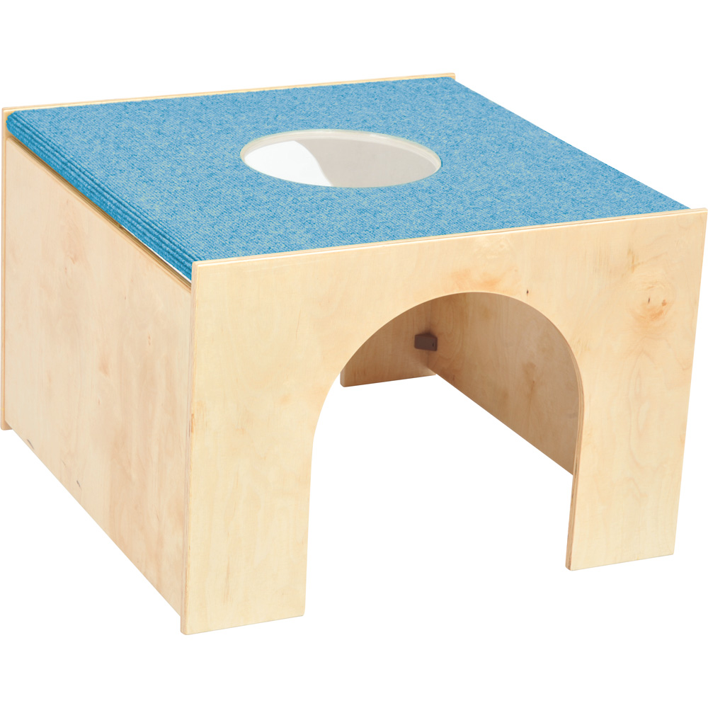 Podest mit begehbarem Glasfenster als Durchguck nach unten. An den Seiten gibt es Eingänge, so dass sich die Kinder verstecken können.