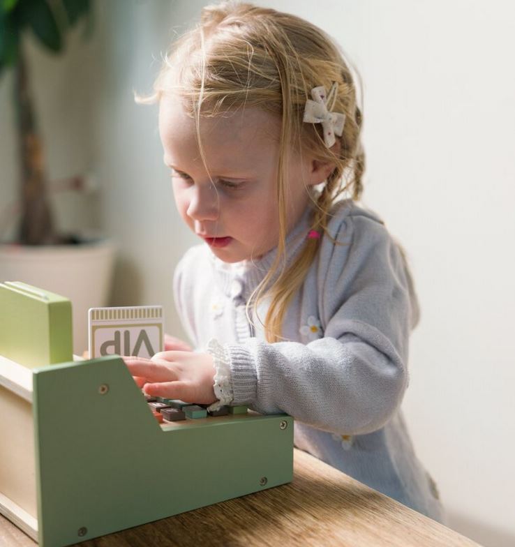 Die Kasse ist liebevoll gestaltet und wird mit Münzgeld, Zahlkarte und Papierbon geliefert – alles, was kleine Kaufleute für ihr Rollenspiel brauchen.