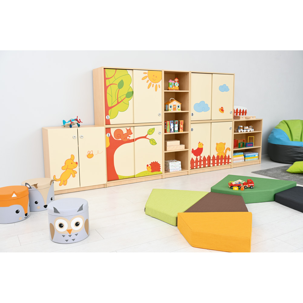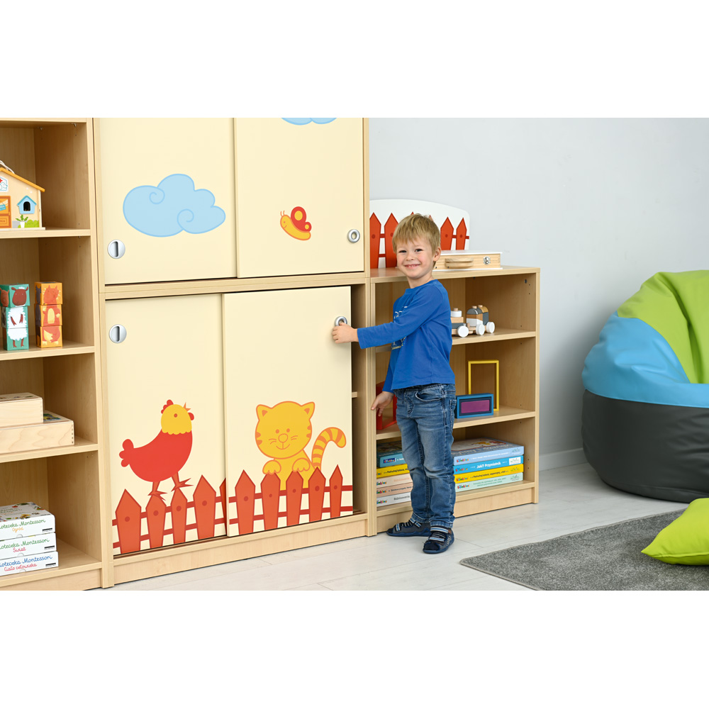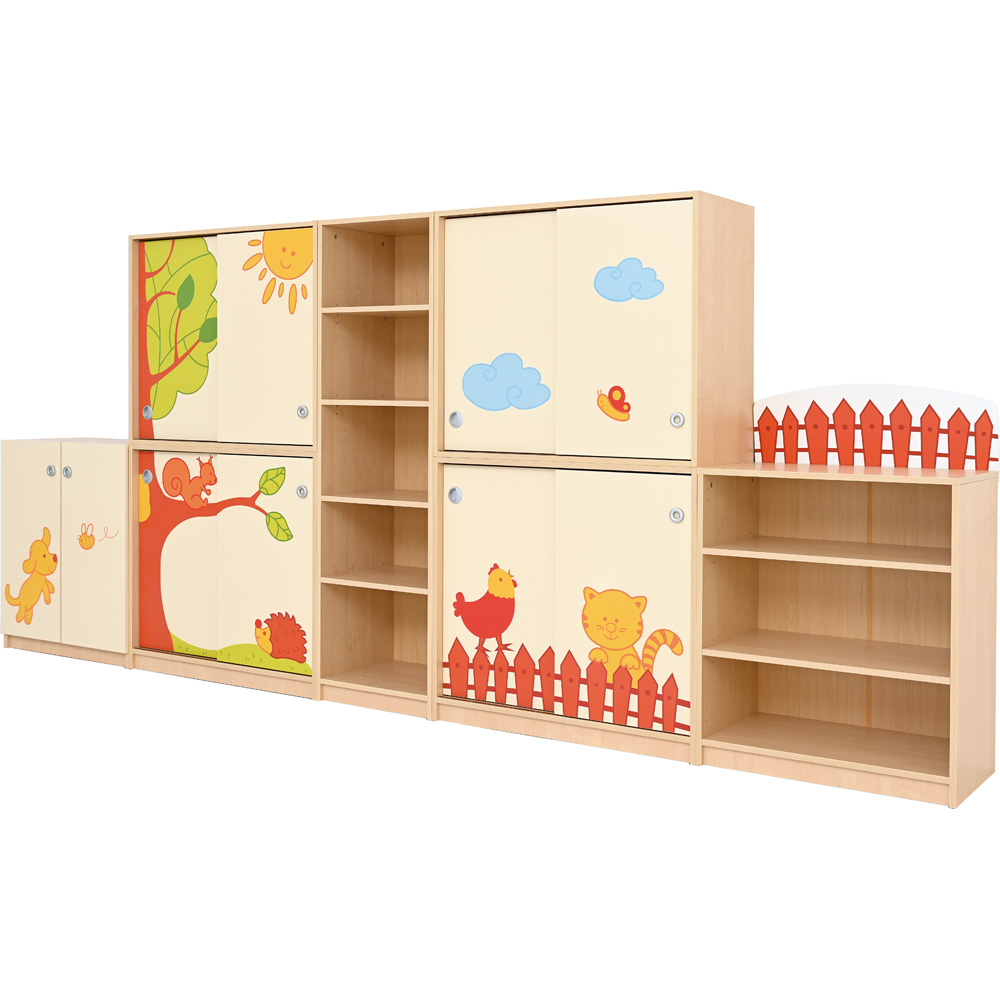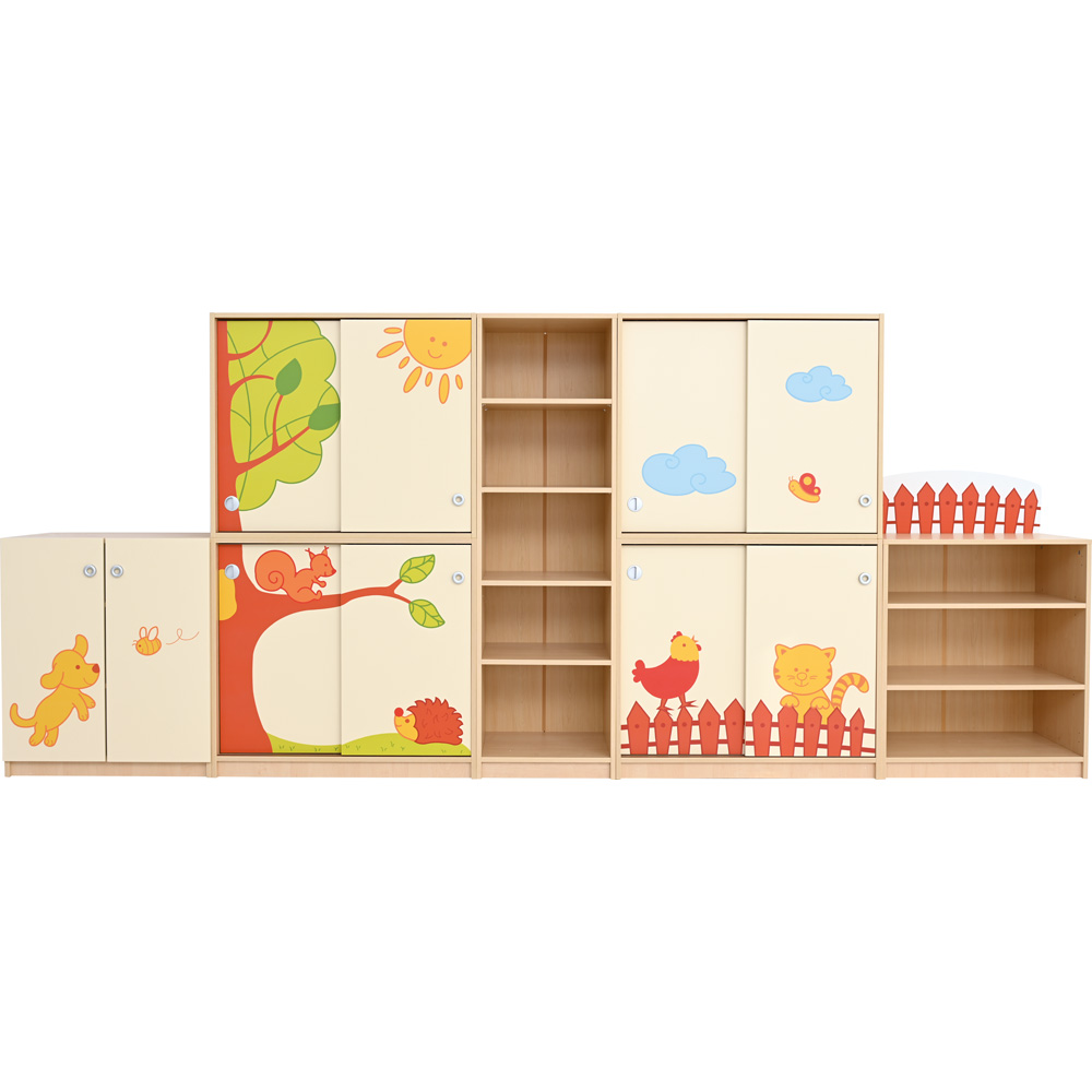 Schränke haben Dreh- oder Schiebetüren, Einlegeböden und offene Fächer. An den Schrankfronten befinden sich lustige Motive, wie sympathische Tiere oder Märchengestalten, die die Kinder spielerisch kennen lernen.