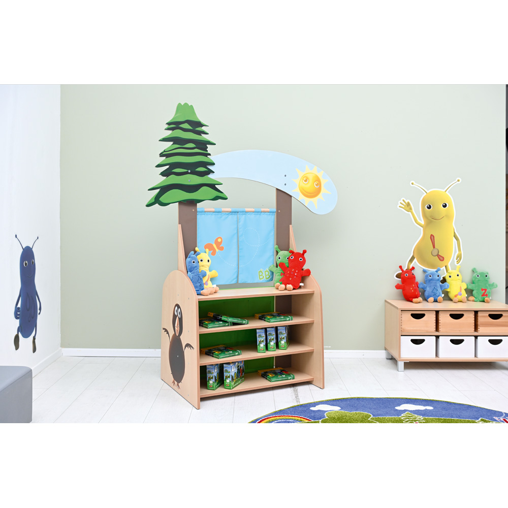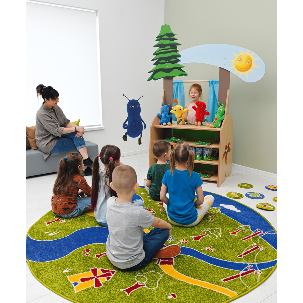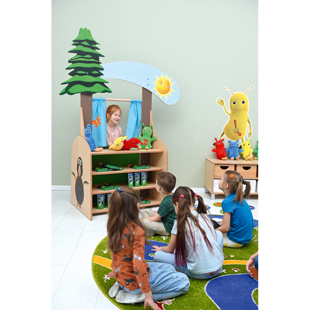 Das Puppentheater kann im Sprachunterricht eingesetzt werden. Durch die Wiederholung von Szenen in englischer oder anderer Sprache bereichern die Kinder ihren Wortschatz. Die Bühne und der Vorhang sorgen für Vorfreude und Überraschung, zum Beispiel wenn Maskottchen auf der Bühne erscheinen und wieder verschwinden. So kann die Aufmerksamkeit der Kinder auf die Bühne und ausgewählte Elemente gelenkt werden, die die Lehrkraft hervorheben möchte. Das Puppentheater kann zusammen mit den Handpuppen, Bildkarten und der Musik aus einem Sprachkurs verwendet werden. Dies ist eine wunderbare Möglichkeit, einfache Inhalte aus Liedern zu festigen oder das Zählen zu lernen.