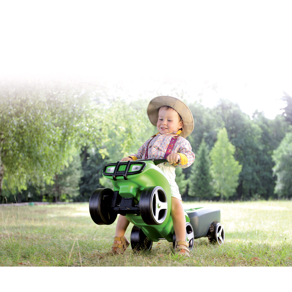 Quad-Crazee-Fahren macht nicht nur Spass, sondern ist auch gesund und schult die Motorik. Die Fahrzeuge sind stabil und haben einen tief liegenden Schwerpunkt, was sicheres Fahren ermöglicht. Dank ergonomischem Sitz und profiliertem Kniebereich haben es die Kinder bequem und sicher. Mit Abschlepphaken und Anhängerkupplung ausgestattet. Schwenkbare Räder sorgen für gute Steuerbarkeit und Wendigkeit, auch mit Anhänger. An dem langlebigen, robusten Spielzeug werden viele Kindergartengenerationen ihre Freude haben. Alle Kanten abgerundet.
