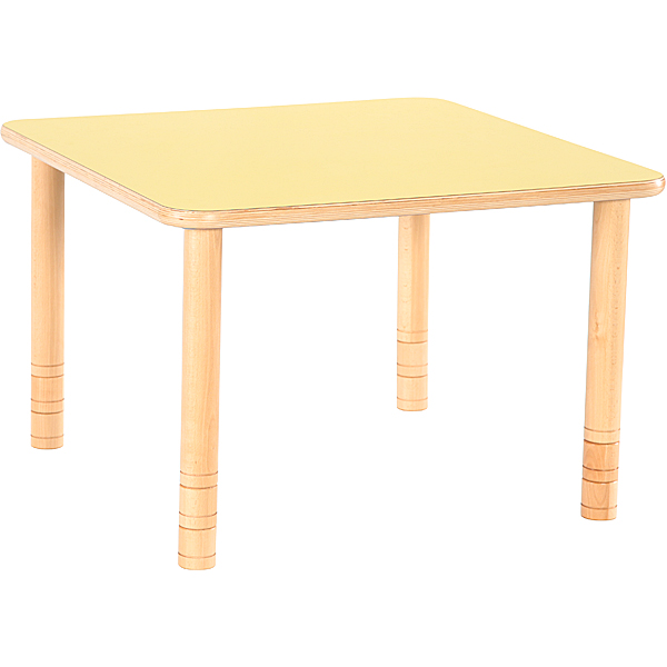 Solide und formschöne Echtholztische. Tischplatte aus farbigem HPL-beschichtetem Sperrholz (Stärke: 25 mm); Kanten und Ecken sind abgerundet. Sie werden inklusive runder Tischbeine (massiv, Ø 55 mm) mit Höhenverstellung geliefert. Tische mit weisser Oberfläche haben weissgebeizte Beine, bei allen anderen sind sie Buche-Natur. Die Befestigung erfolgt mit Metallringen, die eine hohe Stabilität und Haltbarkeit garantieren. Die Tische kann man zu Gruppen zusammenstellen, was verschiedene Beschäftigungen ermöglicht. Die Produktion erfolgt gemäss DIN-EN 1729.