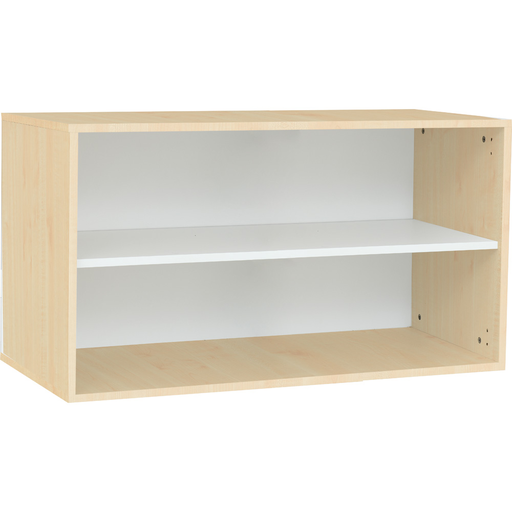 • aus laminierter Spanplatte (Stärke 18 mm) in Ahorn-Dekor (Korpus) und weiss (Rückwand, Einlegeboden)
