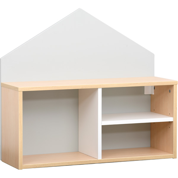Ein bezaubernder Blickfang an den Wänden jedes Gruppenraumes. Hängeregal Häuschen aus laminierter Spanplatte (Stärke 18 mm) - Korpus wahlweise in Ahorn-Dekor oder Weiss, Trennwände und Einlegeböden stets weiss • Rückwand aus farbig folierter MDF-Platte (Stärke 18 mm), in 6 Farben • Fachhöhen: 32 bzw. je 15 cm • Masse: B 79,2 x T 25 x H 70,3 cm