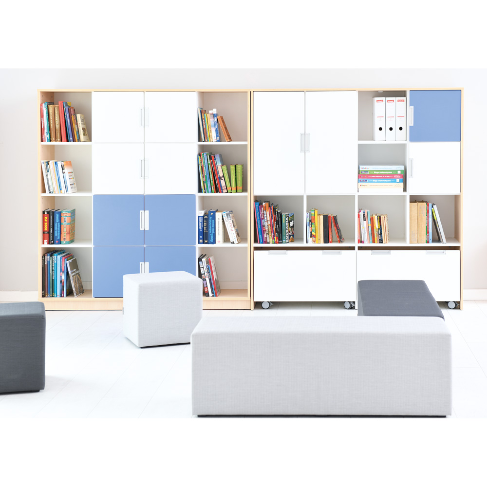 Ein grosser Regalschrank, der viele Gesichter hat und gleich mehrere Zwecke erfüllt. Durch Ergänzung mit zusätzlichen Einlegeböden und diversen Türen lässt sich die Ansicht ganz unterschiedlich gestalten und den Zwecken anpassen. Der obere Teil, der sich ausser Reichweite der Kinder befindet, eignet sich bestens zur Aufbewahrung von Lehrmitteln und Unterlagen. Die Fächer im mittleren Bereich bieten sich an, um Spiele und diverse Angebote offen und für Kinder zugänglich bereitzulegen. Und in den geräumigen Rollbehältern sind Spielsachen und Kleinkram bestens verstaut. Der Schrank bietet Platz für 2 Rollbehälter breit, B 69 (092291-092299, 092003, separat zu bestellen). Im oberen Teil lässt sich ein abschliessbares Türenpaar mittelgross (095421-095432, separat bestellbar) anbringen. Zum Schrank passen ausserdem Türen einzeln, klein und mittelgross, sowohl zur Aussenwand- als auch zur Mittelwandmontage (095385–095420, 096704-096715, separat bestellbar) sowie zusätzliche Einlegeböden (092199 – für Aussenfächer, 092287 – für Mittelfächer).