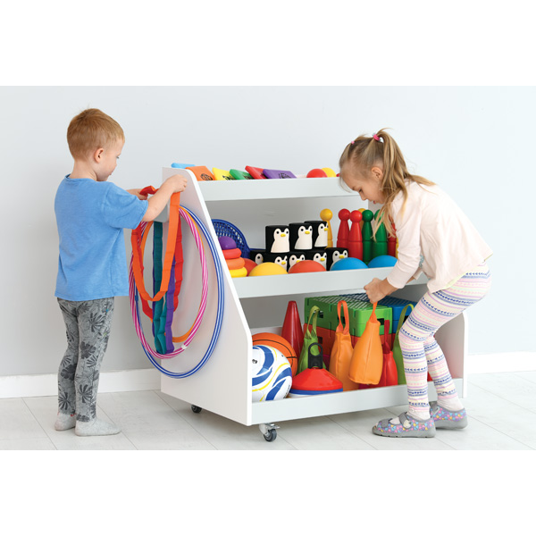 Egal ob Sportartikel, Bastelmaterial oder Spielzeug - dieser funktionelle Wagen dient zur Aufbewahrung verschiedener Materialien und Gegenstände. Am seitlichen Griff können bspw. Reifen aufgehängt werden. Rollen feststellbar.