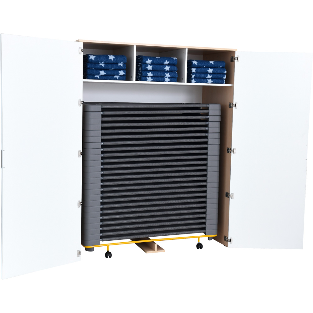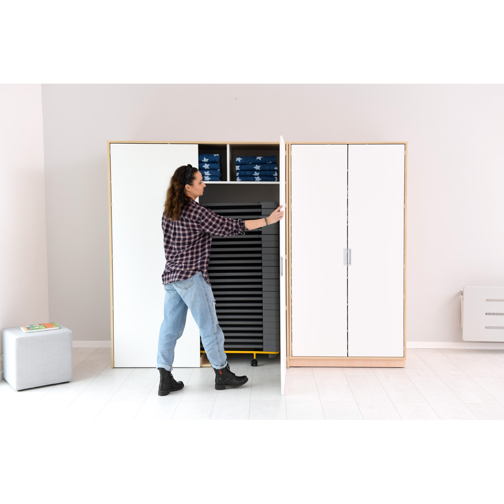 Aufbewahrungsort für 24 Kindergartenbetten und mit 3 kleinen Fächern. In den Schrank ohne Sockel und Boden können die Betten bequem auf dem Transportwagen hineingerollt werden (133146, 133150 - separat bestellbar). Um die Stabilität des Schranks zu gewährleisten, muss er am Fussboden befestigt werden; Montageelemente werden mitgeliefert. In den separat bestellbaren Wäscheschrank (098325(W)) passen 24 Bettwäschegarnituren.