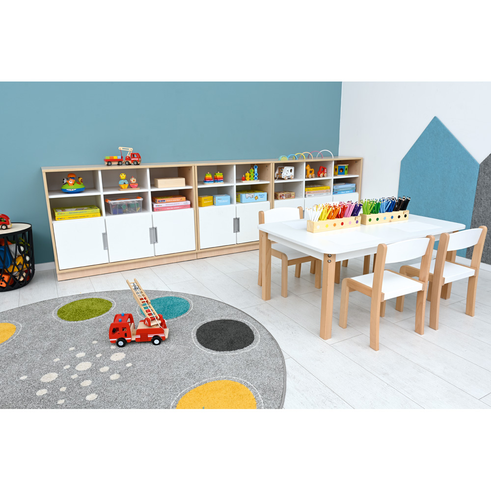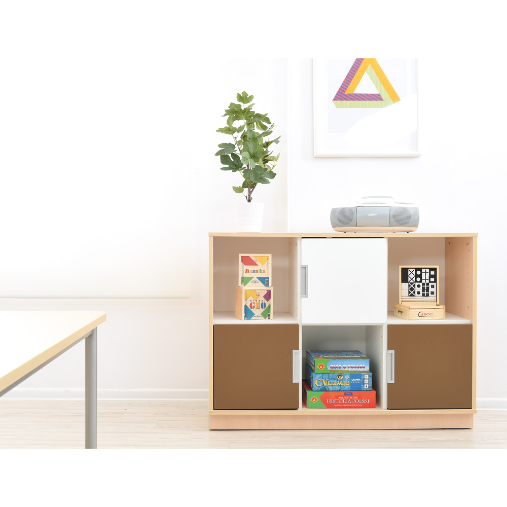 • aus laminierter Spanplatte (Stärke 18 mm), Mittelwände und Einlegeböden immer weiss, Korpus zur Auswahl: weiss oder in Ahorn-Dekor