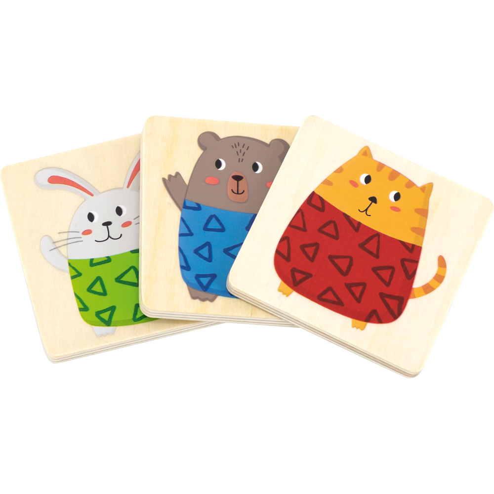 Die Aufgabe der Spieler ist es, 3 Würfel zu werfen, die eine Farbe, ein Muster und ein Tier zeigen, und dann die zur gewürfelten Kombination passende Karte mit dem entsprechend gekleideten Tier zu finden. Fördert das logische Denken, die visuelle Wahrnehmung und die Auge-Hand-Koordination.