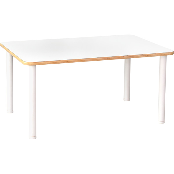 Solide und formschöne Echtholztische. Tischplatte aus farbigem HPL-beschichtetem Sperrholz (Stärke: 25 mm); Kanten und Ecken sind abgerundet. Sie werden inklusive runder Tischbeine (massiv, Ø 55 mm) mit Höhenverstellung geliefert. Tische mit weisser Oberfläche haben weissgebeizte Beine, bei allen anderen sind sie Buche-Natur. Die Befestigung erfolgt mit Metallringen, die eine hohe Stabilität und Haltbarkeit garantieren. Die Tische kann man zu Gruppen zusammenstellen, was verschiedene Beschäftigungen ermöglicht. Die Produktion erfolgt gemäss DIN-EN 1729.