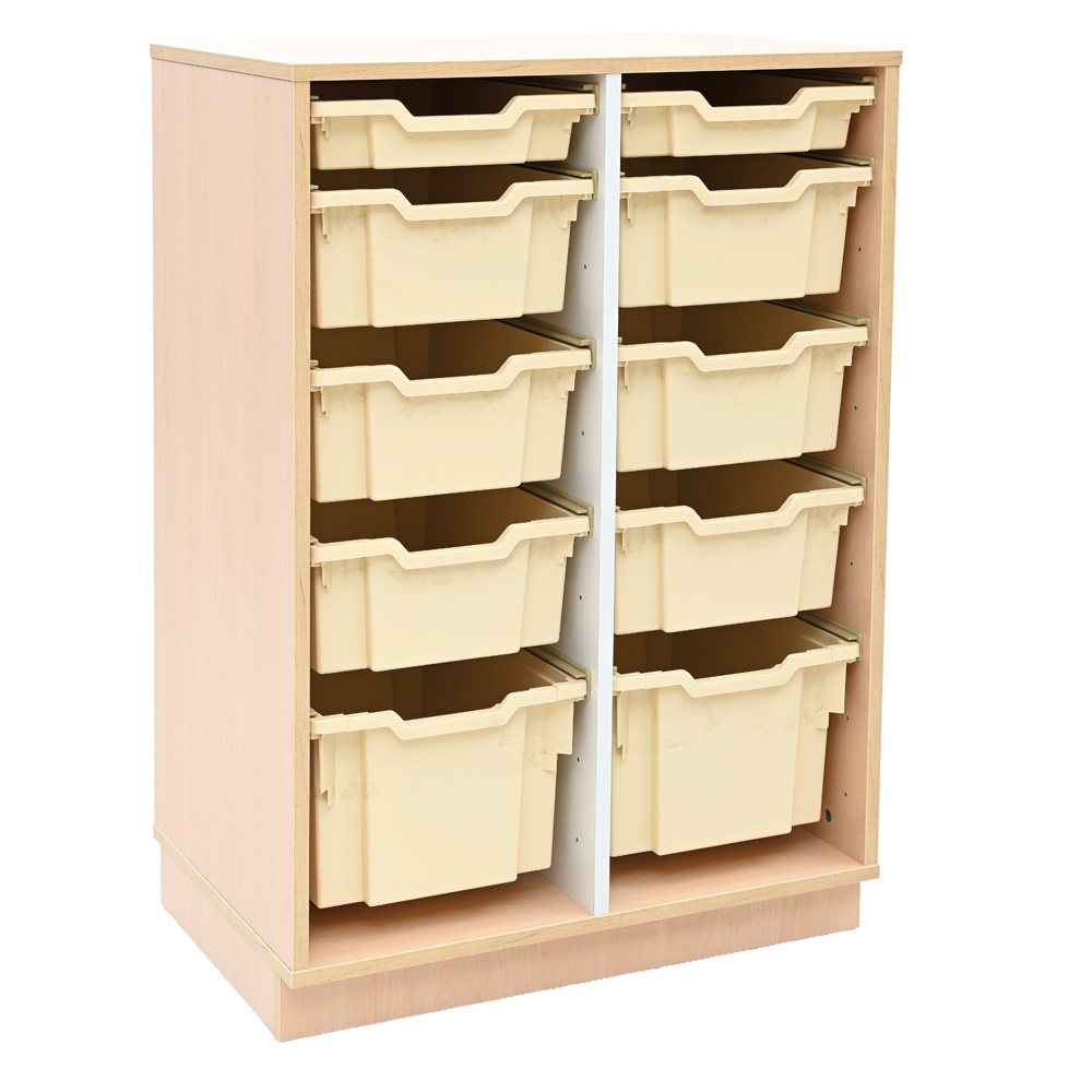 Die geräumigen Fächer sind mit Kunststoffbehältern bestückt. Behälter sind bruchsicher, formstabil und robust - ideal für den Alltag in Kita und Schule. Führungsschienen inbegriffen.