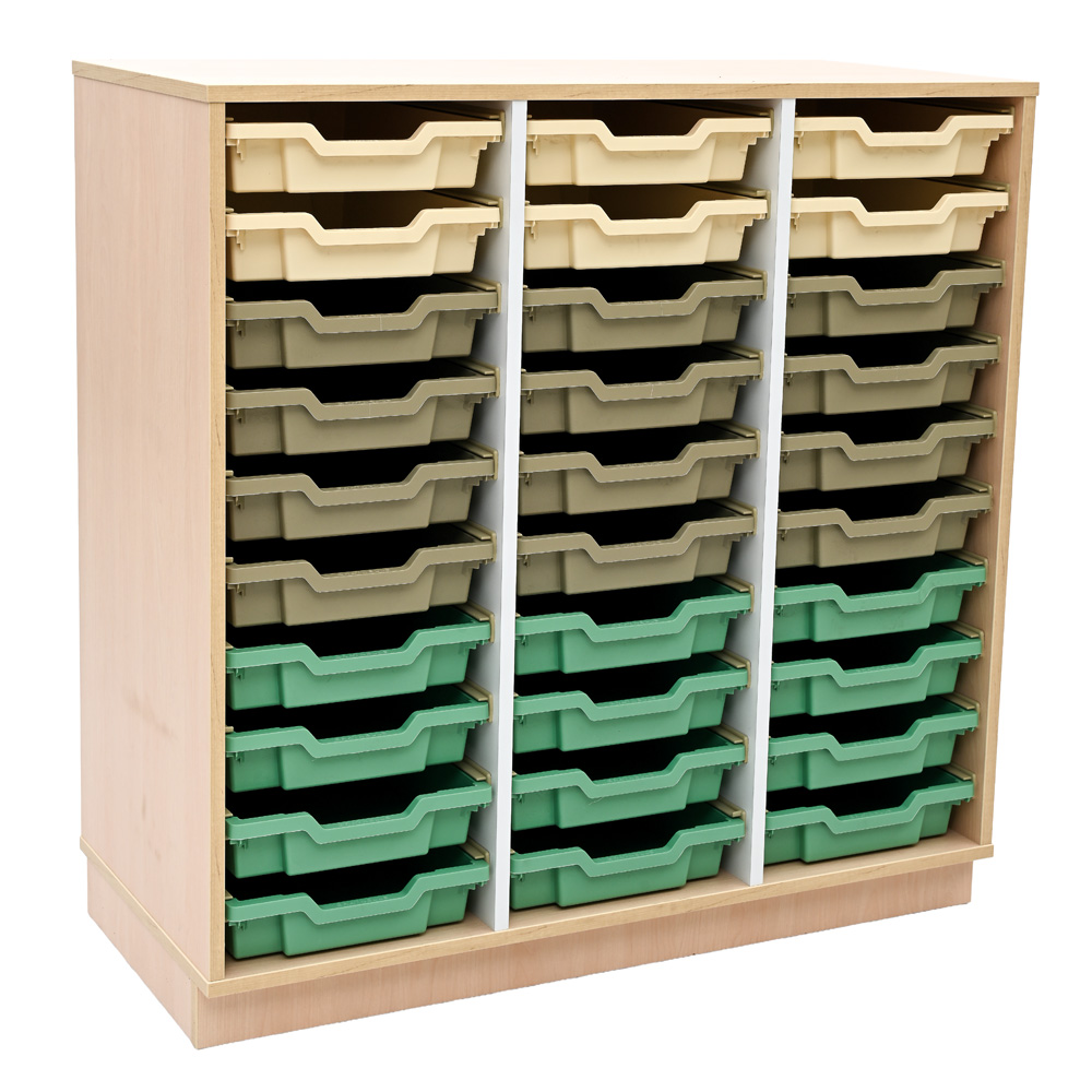 Die geräumigen Fächer sind mit Kunststoffbehältern bestückt. Behälter sind bruchsicher, formstabil und robust - ideal für den Alltag in Kita und Schule. Führungsschienen inbegriffen.