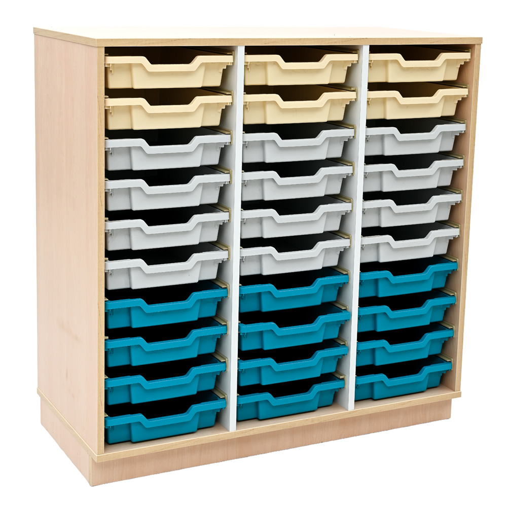 Die geräumigen Fächer sind mit Kunststoffbehältern bestückt. Behälter sind bruchsicher, formstabil und robust - ideal für den Alltag in Kita und Schule. Führungsschienen inbegriffen.