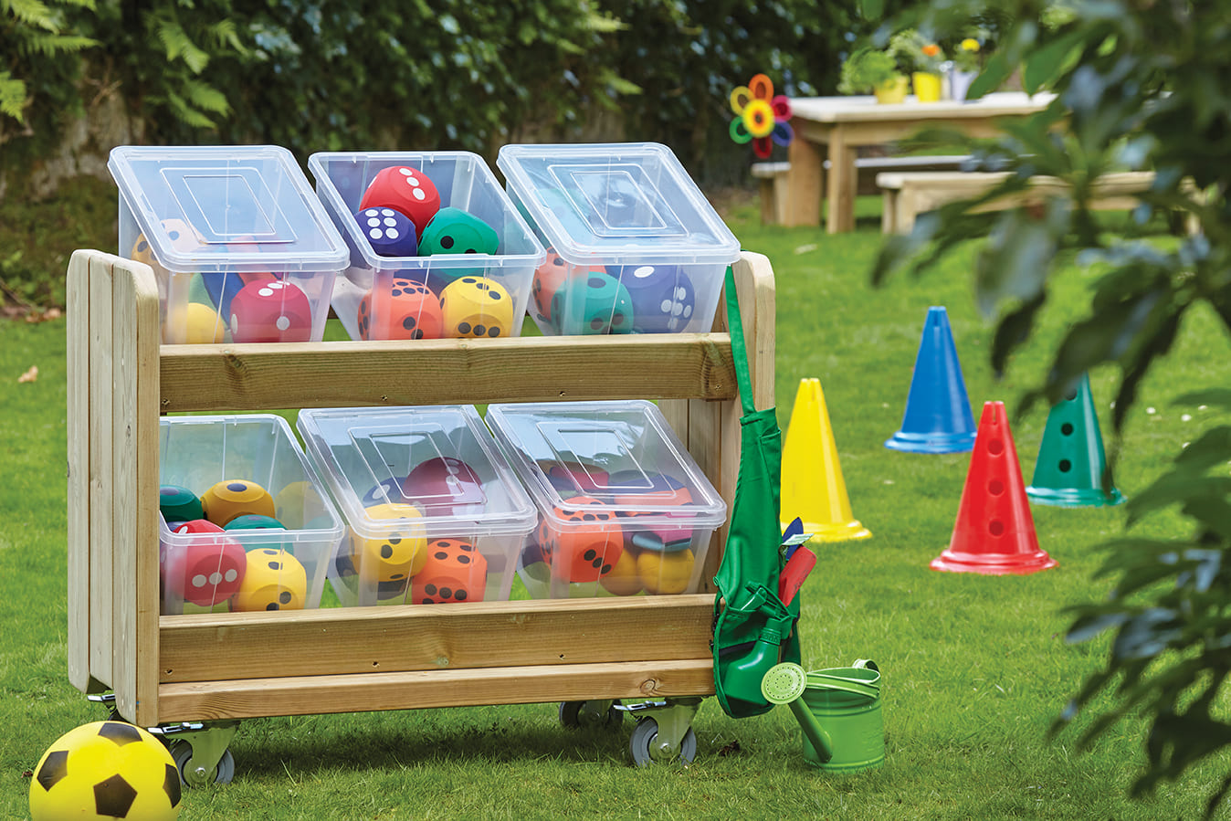 Regal auf Rollen für den Aussenbereich mit 6 transparenten Behältern, die für einen einfachen Zugriff geneigt sind. Die Behälter werden mit Deckeln zum Schutz vor Witterungseinflüssen geliefert.