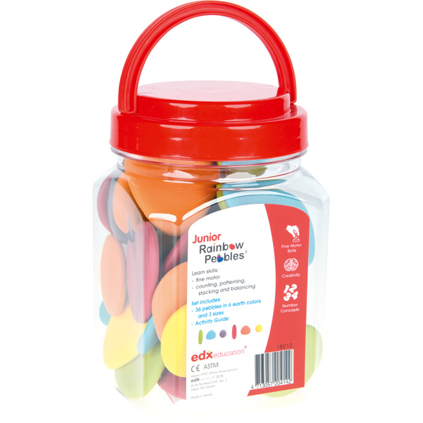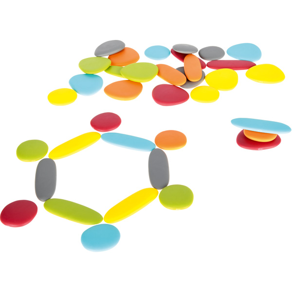 Ein Satz bunter Kieselsteine zum Sortieren, Stapeln und Spielen. In einem Kunststoffglas verstaubar.