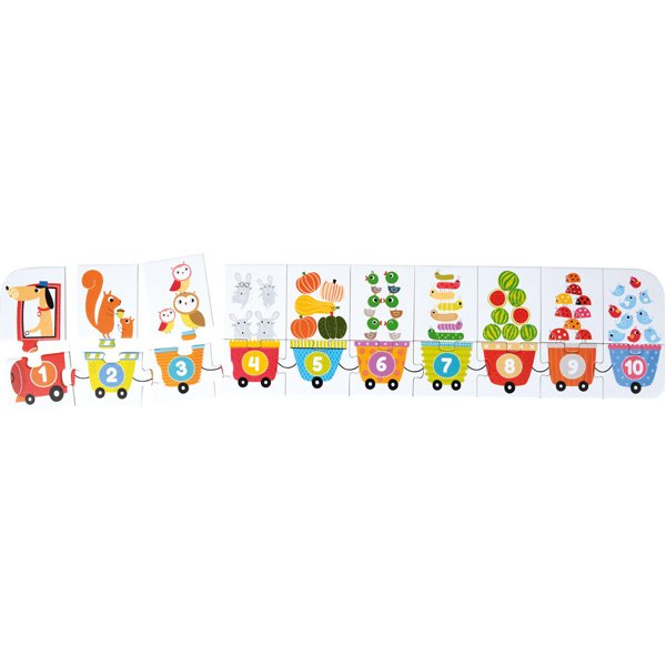 Puzzle, das nicht nur Wahrnehmung und Auge-Hand-Koordination fördert, sondern Kinder auch spielerisch an Zahlen heranführt. Die lustige Eisenbahn transportiert freundliche Passagiere und leckere Fracht, die je nach Anzahl in den richtigen Waggon gesetzt und schliesslich in der richtigen Reihenfolge an die Lok gehängt werden sollen. Die grossen Puzzleteile lassen sich leicht zusammensetzen.