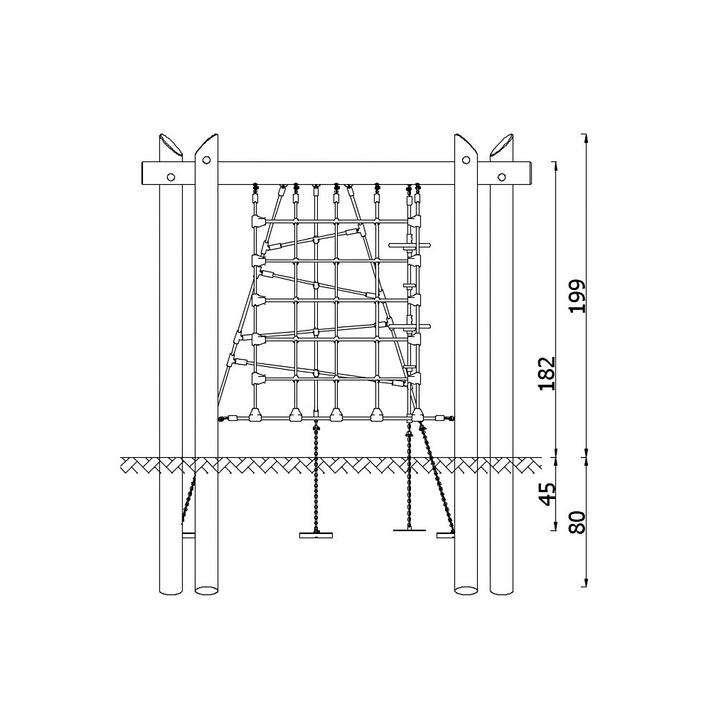 Die Kletternetzkombination bietet mit unterschiedlichen Netzen und einem Kletterseil verschiedene Herausforderungen auf kleinem Raum und ist somit perfekt für Einrichtungen mit wenig Platz und altersgemischten Gruppen. Jedes Kind kann sich nach seinen Fähigkeiten ausprobieren und daran wachsen. • Pfosten aus natürlich gewachsenem, unbehandeltem Robinienrundholz, direkt im Boden verankert • Anzahl der Nutzer: 9 • Grundfläche: 240 x 191 cm • Sicherheitsbereich: 604 x 491 cm (Fläche: 25 m²) • Gesamthöhe: 199 cm • max. freie Fallhöhe: 182 cm • von 3 bis 14 Jahren