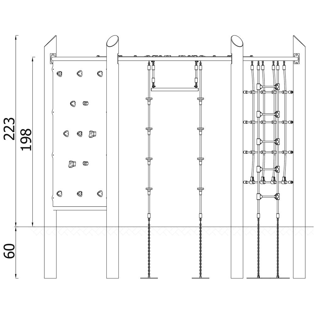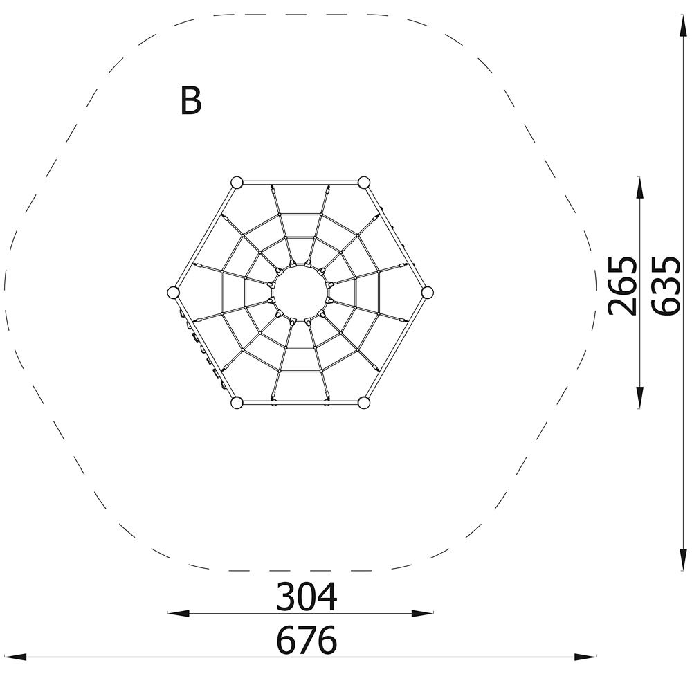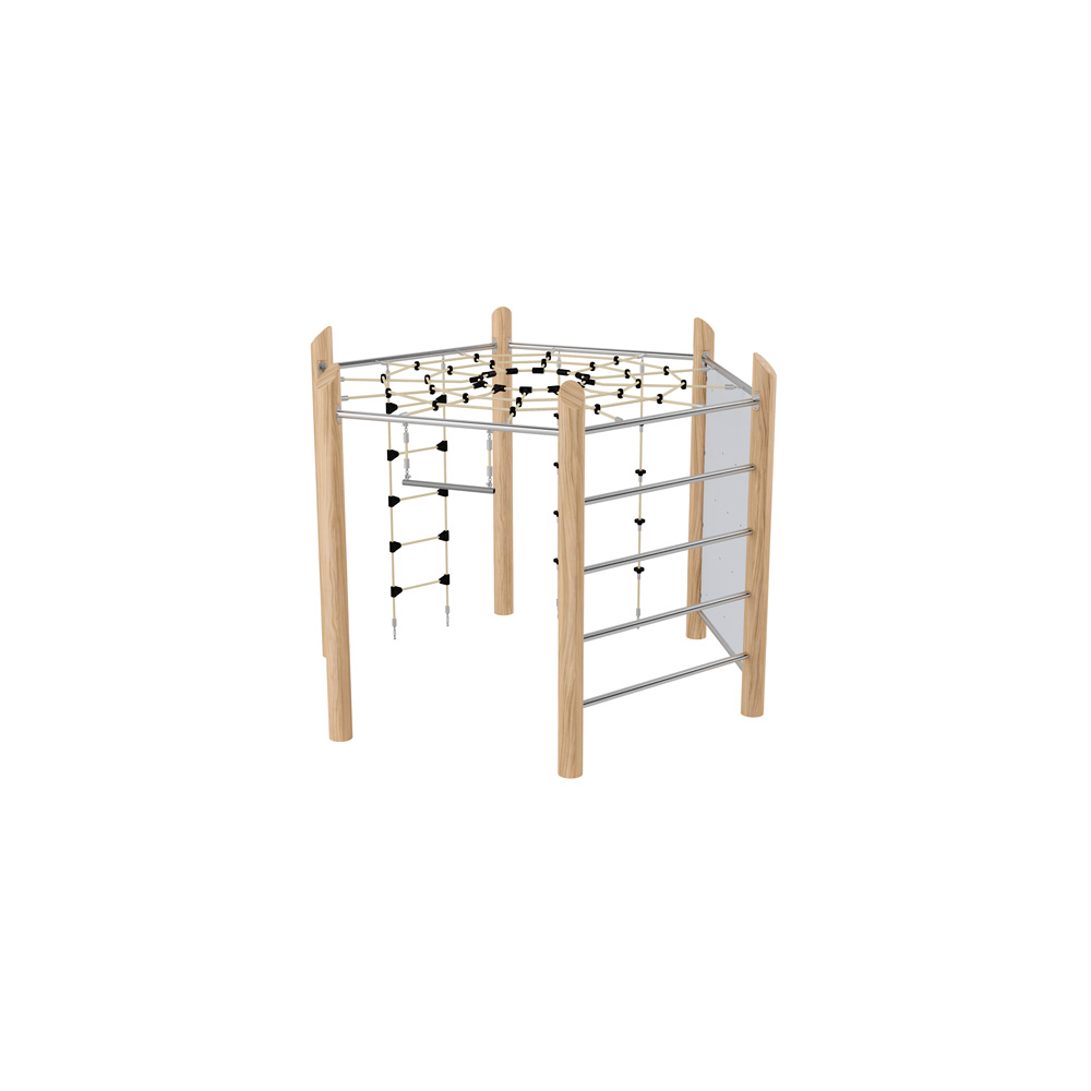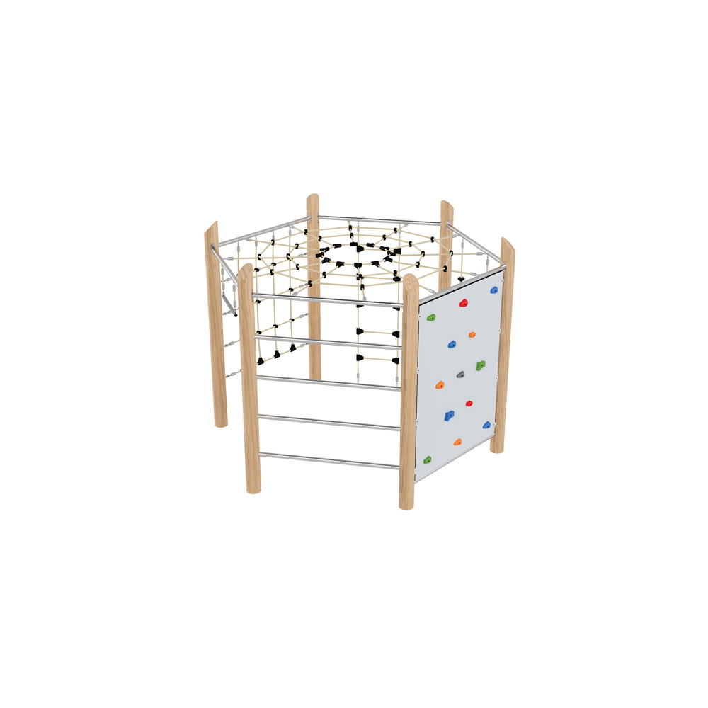 Das klassische Klettersechseck bietet auf kleinem Raum zahlreiche Klettermöglichkeiten und wird schnell zum Mittelpunkt des Spielplatzes. Mit Kletterwand, Kletternetz, Kletterseilen und Strickleiter, Sprossenwand und Reck. Den Höhepunkt bildet das Spinnennetz als oberer Abschluss. • Pfosten aus natürlich gewachsenem, unbehandeltem Robinienrundholz, direkt im Boden verankert • Anzahl der Nutzer: 18 • Grundfläche: 304 x 265 cm • Sicherheitsbereich: 676 x 635 cm (Fläche: 34 m²) • Gesamthöhe: 223 cm • max. freie Fallhöhe: 198 cm • von 3 bis 14 Jahren