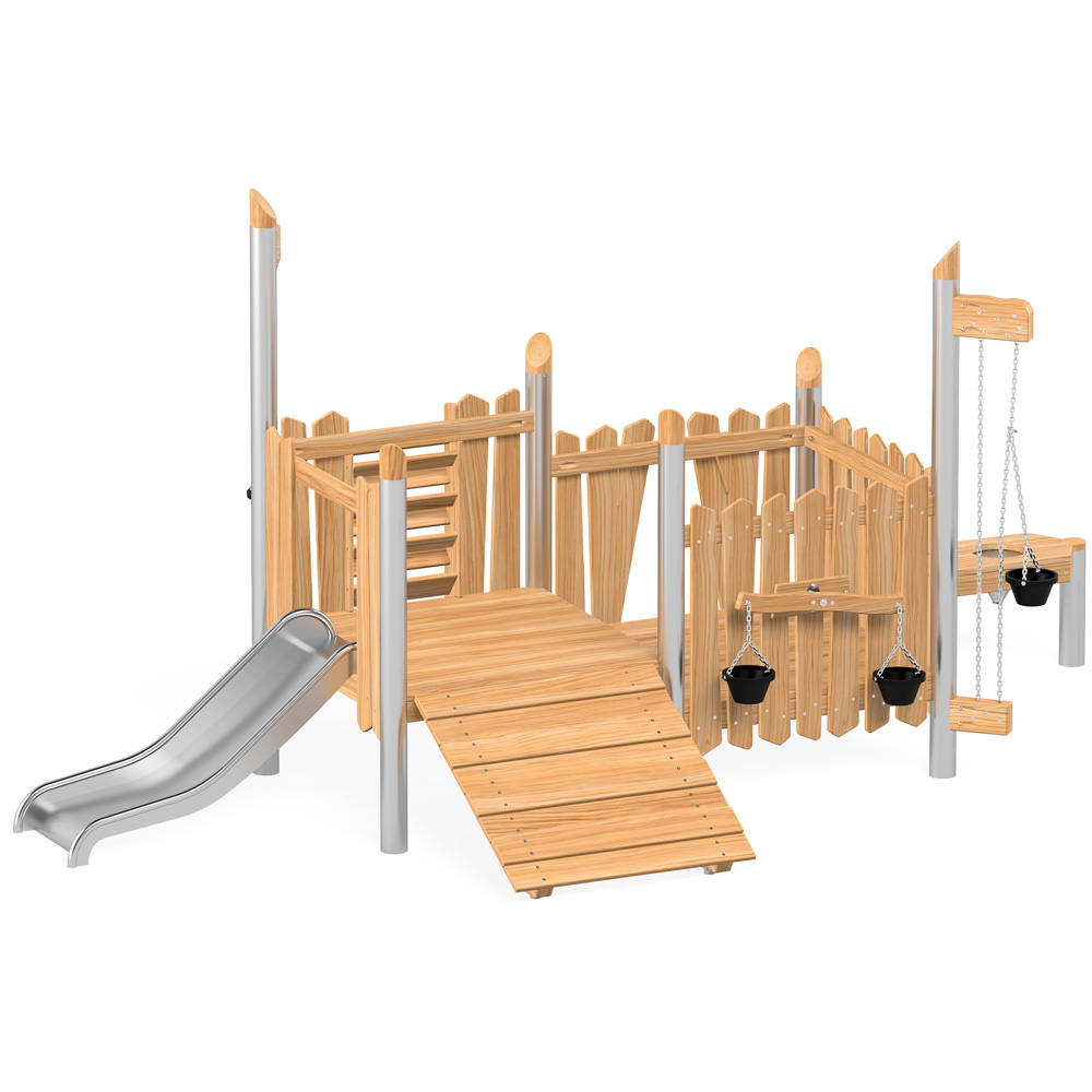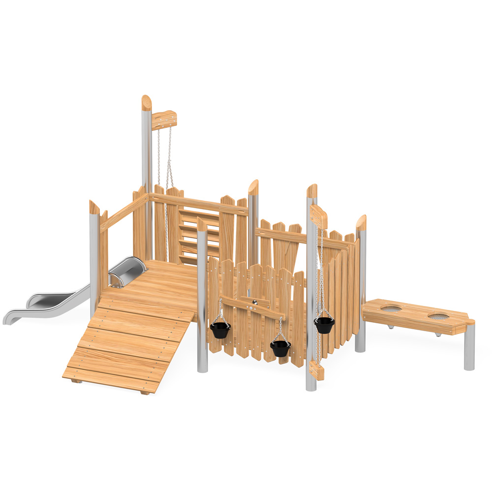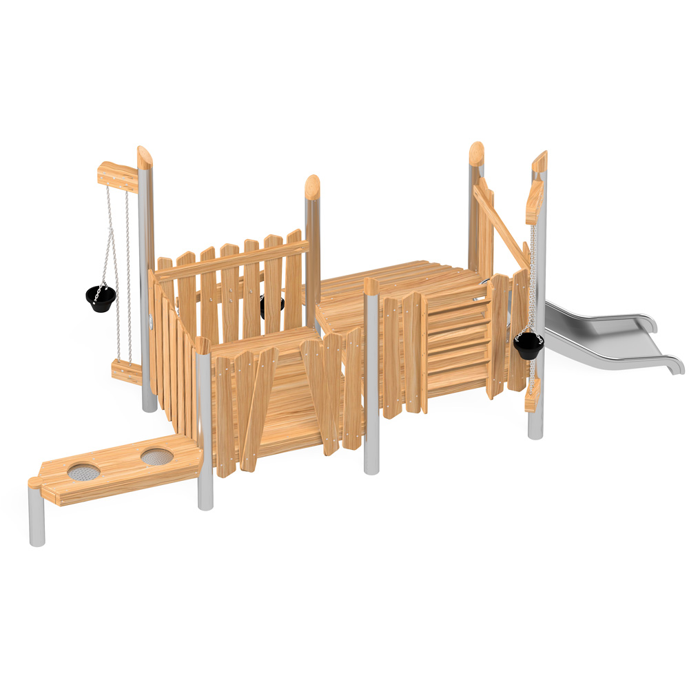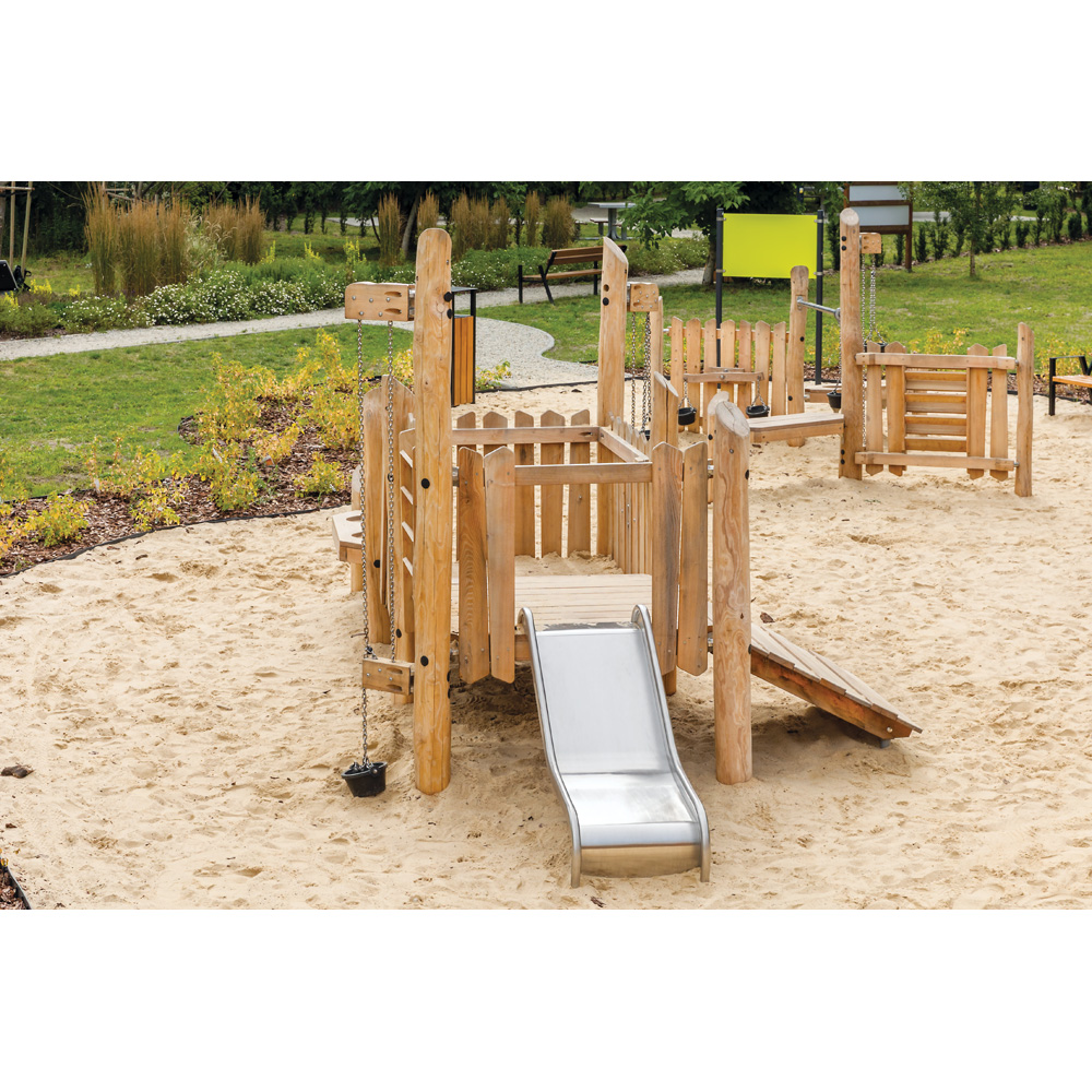 Robinio ist ein aussergewöhnlicher Abenteuerspielplatz für alle Kids. Die Serie vereint den Reiz der Natürlichkeit von Robinienholz mit der edlen Optik und den Vorzügen von Edelstahl, wie höchste Witterungsbeständigkeit und Langlebigkeit bei minimalem Wartungsaufwand. Robinie ist ein sehr festes und dank seinem hohen Ölgehalt natürlich konserviertes Holz, das sich hervorragend für Spielplätze eignet. Kleine Details wie die angeschrägten Pfostenschutzkappen aus Holz verleihen der Serie das besondere Etwas. Alle Geräte entsprechen DIN EN 1176 und sind zertifiziert, erfüllen somit die Voraussetzungen für den öffentlichen Bereich. Wir gewähren 2 Jahre Garantie.