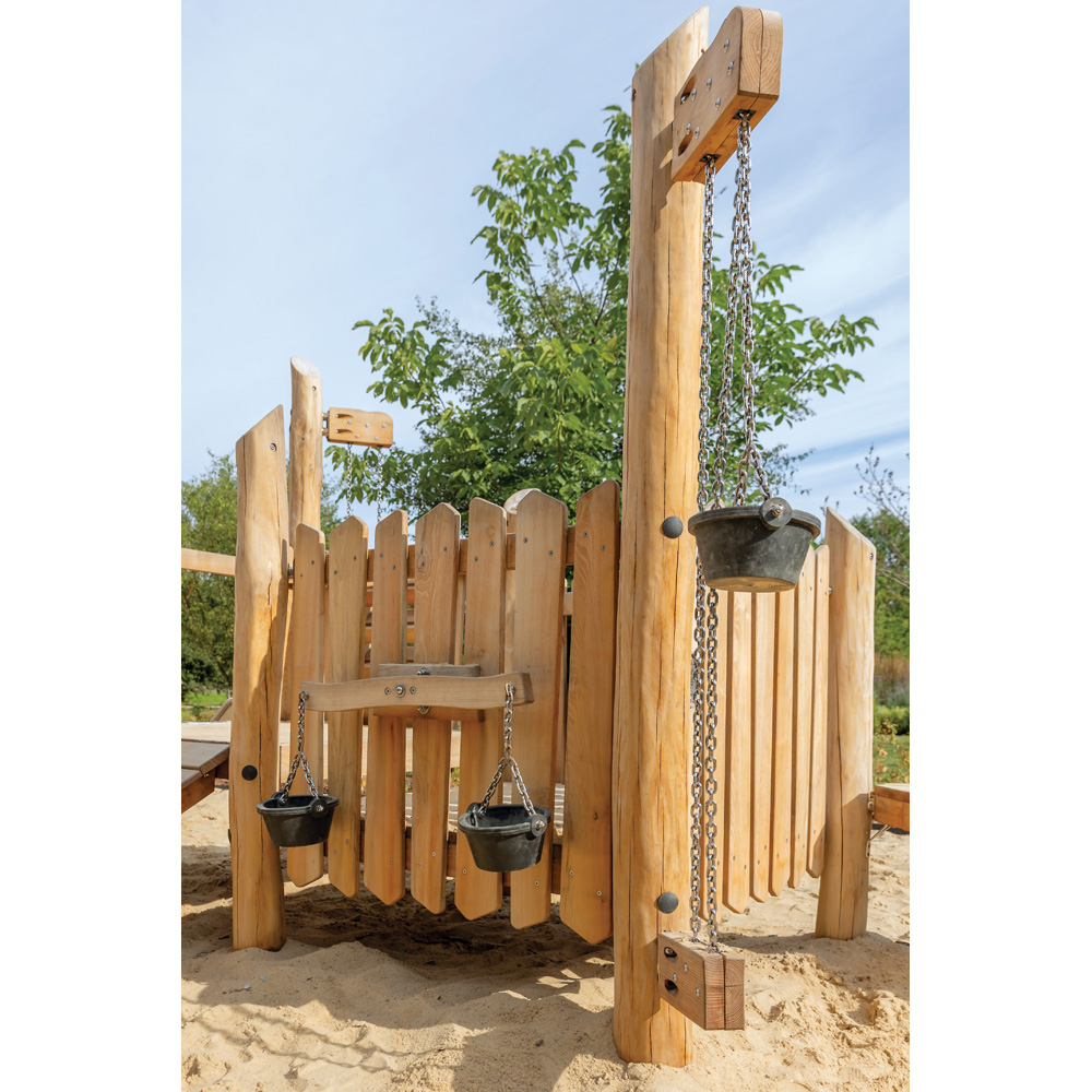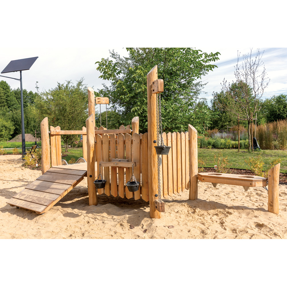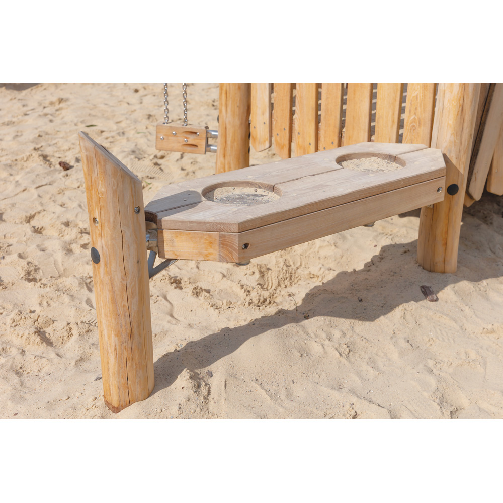 Was sich mit Sand so alles machen lässt! Zur Spielanlage aus 2 Podesten gehören Rutsche, Sandtrichter sowie Seilzüge und Balkenwaage inkl. 4 Eimern.