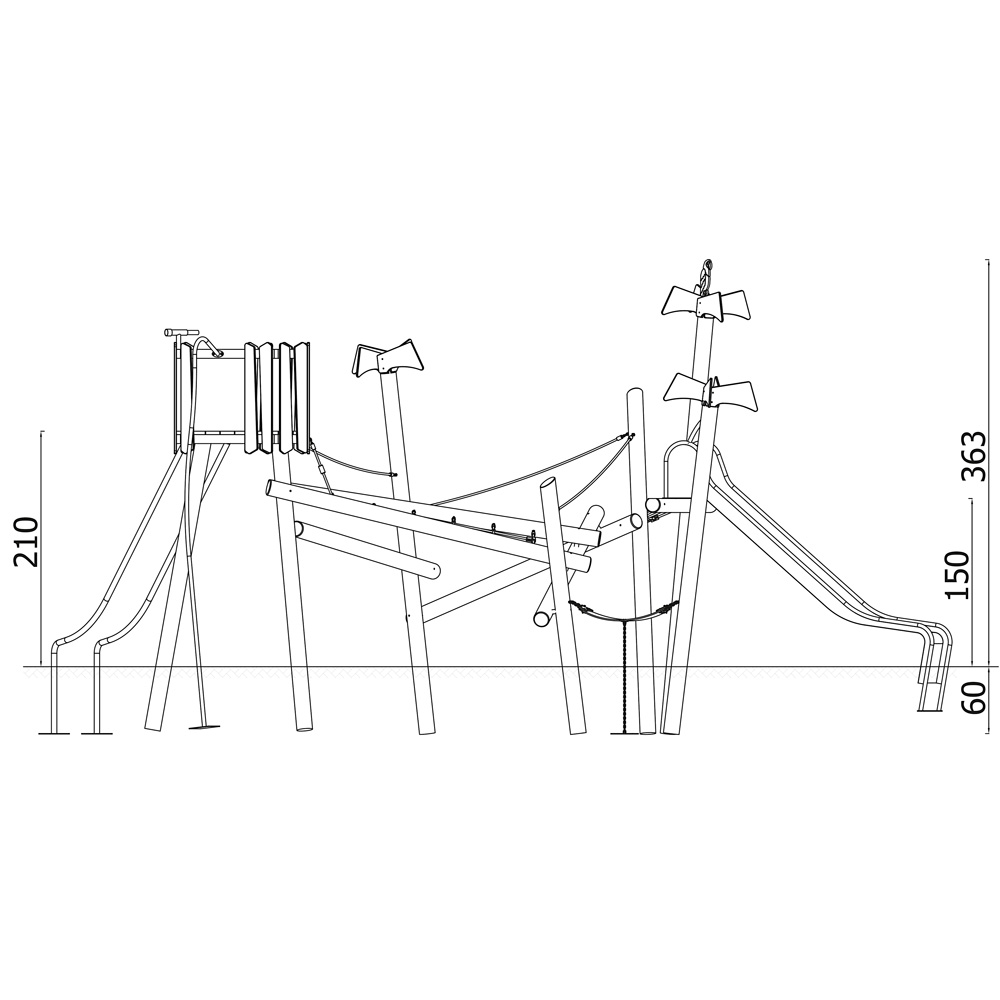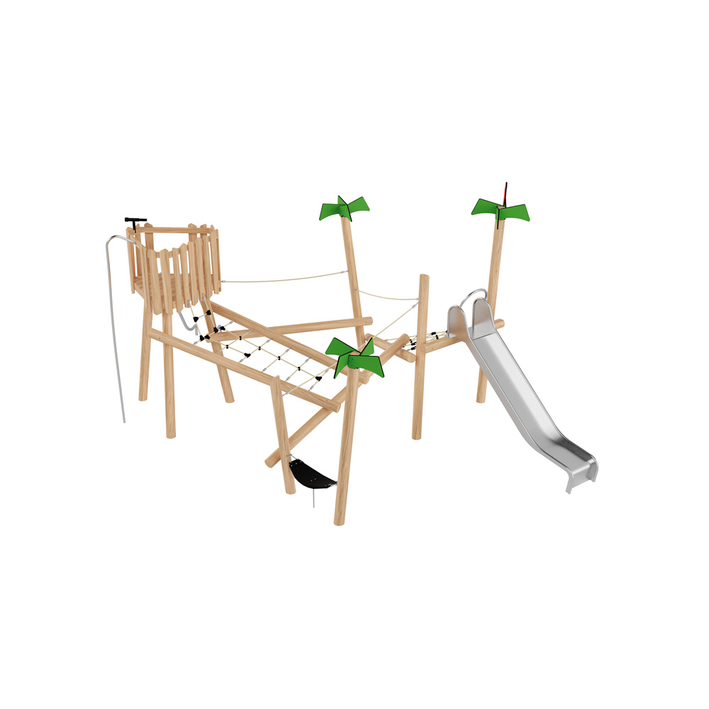 Robinio ist ein aussergewöhnlicher Abenteuerspielplatz für alle Kids. Die Serie vereint den Reiz der Natürlichkeit von Robinienholz mit der edlen Optik und den Vorzügen von Edelstahl, wie höchste Witterungsbeständigkeit und Langlebigkeit bei minimalem Wartungsaufwand. Robinie ist ein sehr festes und dank seinem hohen Ölgehalt natürlich konserviertes Holz, das sich hervorragend für Spielplätze eignet. Kleine Details wie die angeschrägten Pfostenschutzkappen aus Holz verleihen der Serie das besondere Etwas. Alle Geräte entsprechen DIN EN 1176 und sind zertifiziert, erfüllen somit die Voraussetzungen für den öffentlichen Bereich. • Material: Edelstahlrundpfosten (Ø 102 mm), direkt im Boden verankert und absolut korrosionsbeständig, dekorative Schutzkappen aus verleimtem Kantholz • einige Geräte mit Robinienrundholzpfosten, direkt im Boden verankert • naturbelassenes, unbehandeltes Robinienholz, extrem haltbar • Rutschen, Stangen und Befestigungselemente aus Edelstahl • farblich angepasste Seile aus PP mit Stahlkern