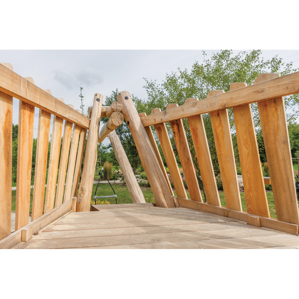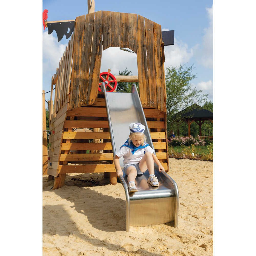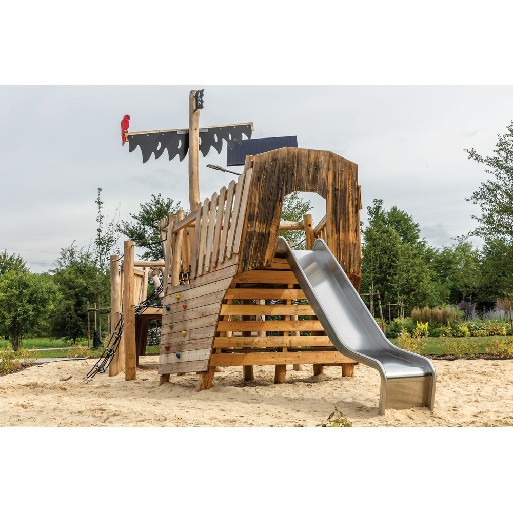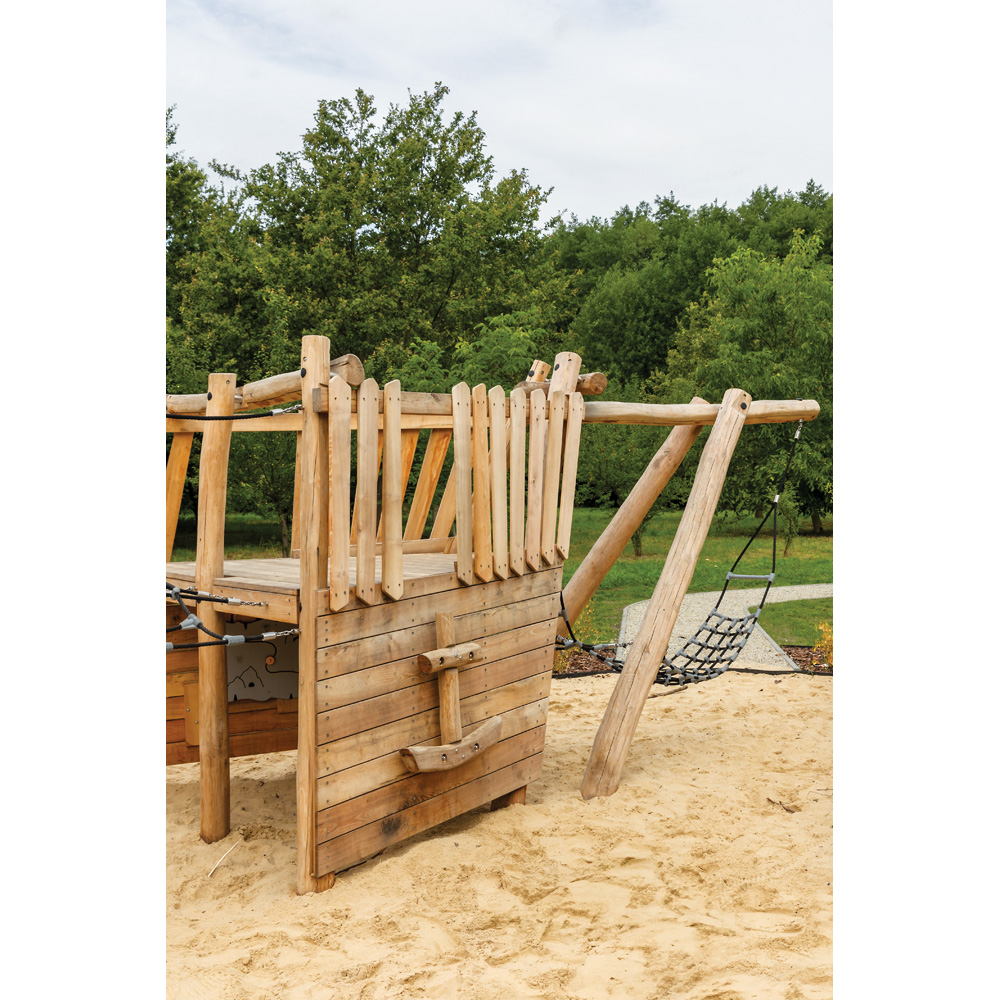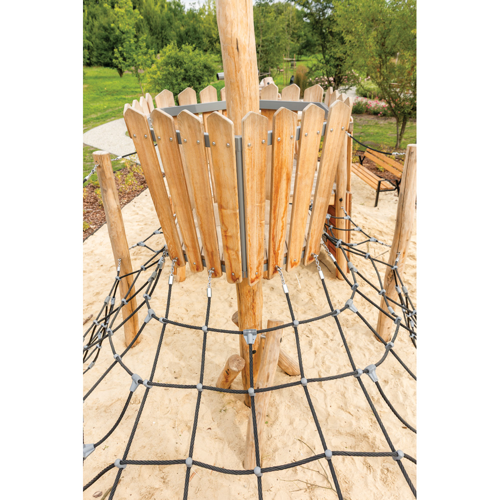 Robinio ist ein aussergewöhnlicher Abenteuerspielplatz für alle Kids. Die Serie vereint den Reiz der Natürlichkeit von Robinienholz mit der edlen Optik und den Vorzügen von Edelstahl, wie höchste Witterungsbeständigkeit und Langlebigkeit bei minimalem Wartungsaufwand. Robinie ist ein sehr festes und dank seinem hohen Ölgehalt natürlich konserviertes Holz, das sich hervorragend für Spielplätze eignet. Kleine Details wie die angeschrägten Pfostenschutzkappen aus Holz verleihen der Serie das besondere Etwas. Alle Geräte entsprechen DIN EN 1176 und sind zertifiziert, erfüllen somit die Voraussetzungen für den öffentlichen Bereich. • Material: Edelstahlrundpfosten (Ø 102 mm), direkt im Boden verankert und absolut korrosionsbeständig, dekorative Schutzkappen aus verleimtem Kantholz • einige Geräte mit Robinienrundholzpfosten, direkt im Boden verankert • naturbelassenes, unbehandeltes Robinienholz, extrem haltbar • Rutschen, Stangen und Befestigungselemente aus Edelstahl • farblich angepasste Seile aus PP mit Stahlkern