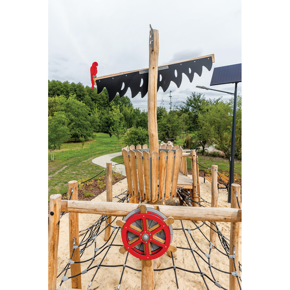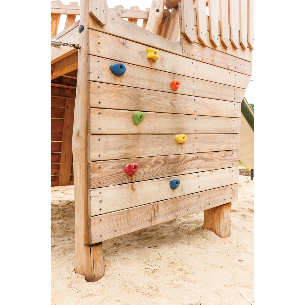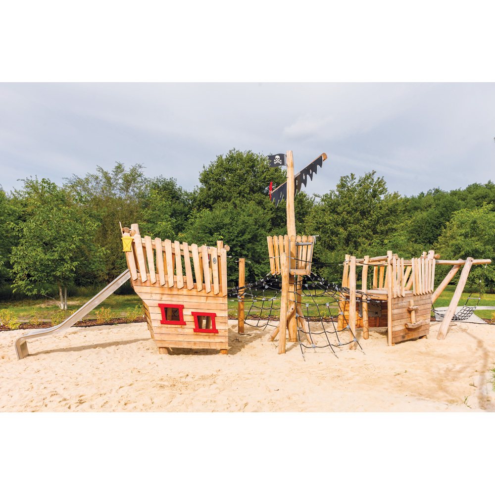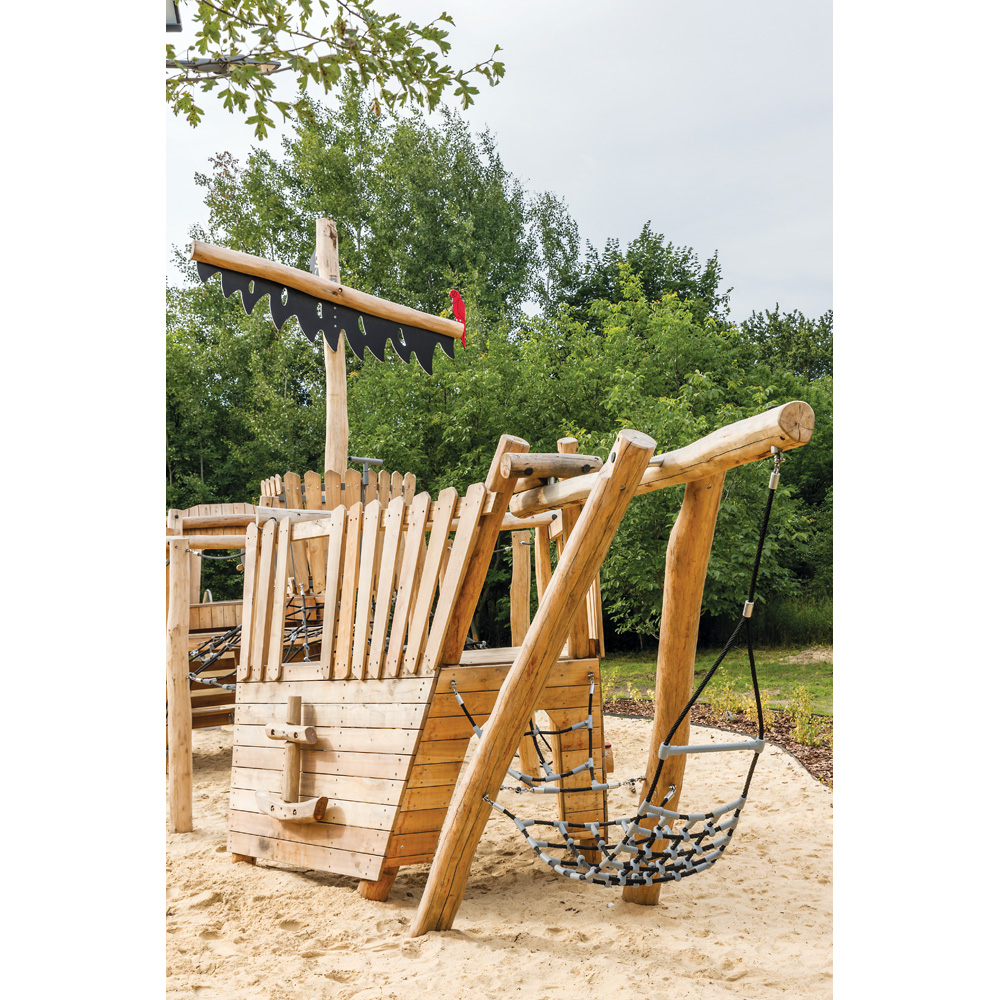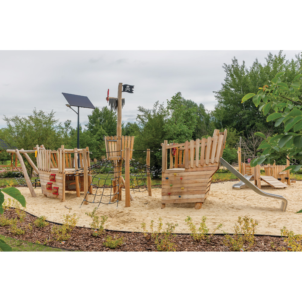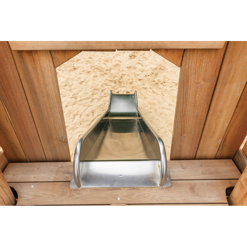 Robinio ist ein aussergewöhnlicher Abenteuerspielplatz für alle Kids. Die Serie vereint den Reiz der Natürlichkeit von Robinienholz mit der edlen Optik und den Vorzügen von Edelstahl, wie höchste Witterungsbeständigkeit und Langlebigkeit bei minimalem Wartungsaufwand. Robinie ist ein sehr festes und dank seinem hohen Ölgehalt natürlich konserviertes Holz, das sich hervorragend für Spielplätze eignet. Kleine Details wie die angeschrägten Pfostenschutzkappen aus Holz verleihen der Serie das besondere Etwas. Alle Geräte entsprechen DIN EN 1176 und sind zertifiziert, erfüllen somit die Voraussetzungen für den öffentlichen Bereich. • Material: Edelstahlrundpfosten (Ø 102 mm), direkt im Boden verankert und absolut korrosionsbeständig, dekorative Schutzkappen aus verleimtem Kantholz • einige Geräte mit Robinienrundholzpfosten, direkt im Boden verankert • naturbelassenes, unbehandeltes Robinienholz, extrem haltbar • Rutschen, Stangen und Befestigungselemente aus Edelstahl • farblich angepasste Seile aus PP mit Stahlkern