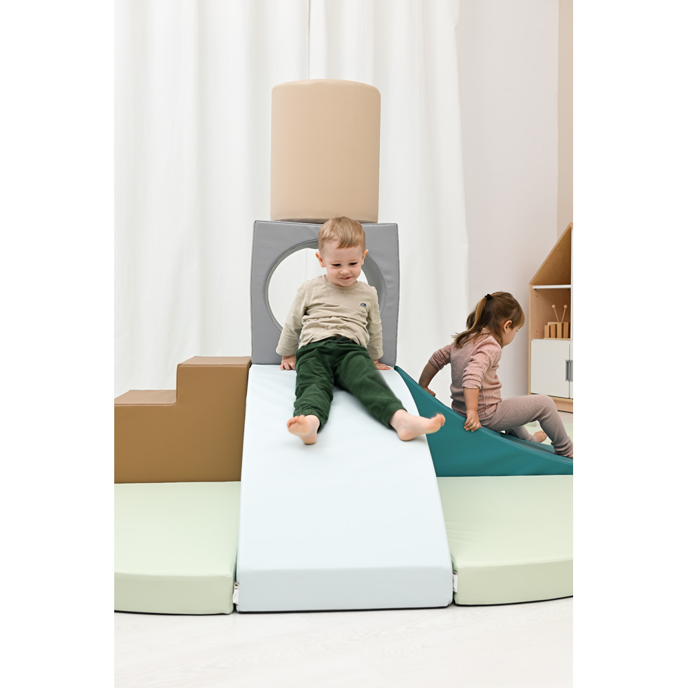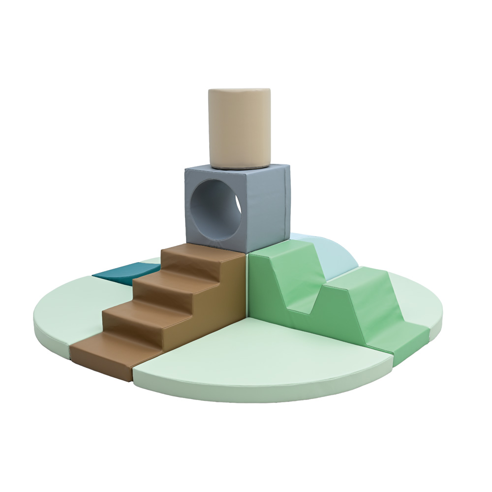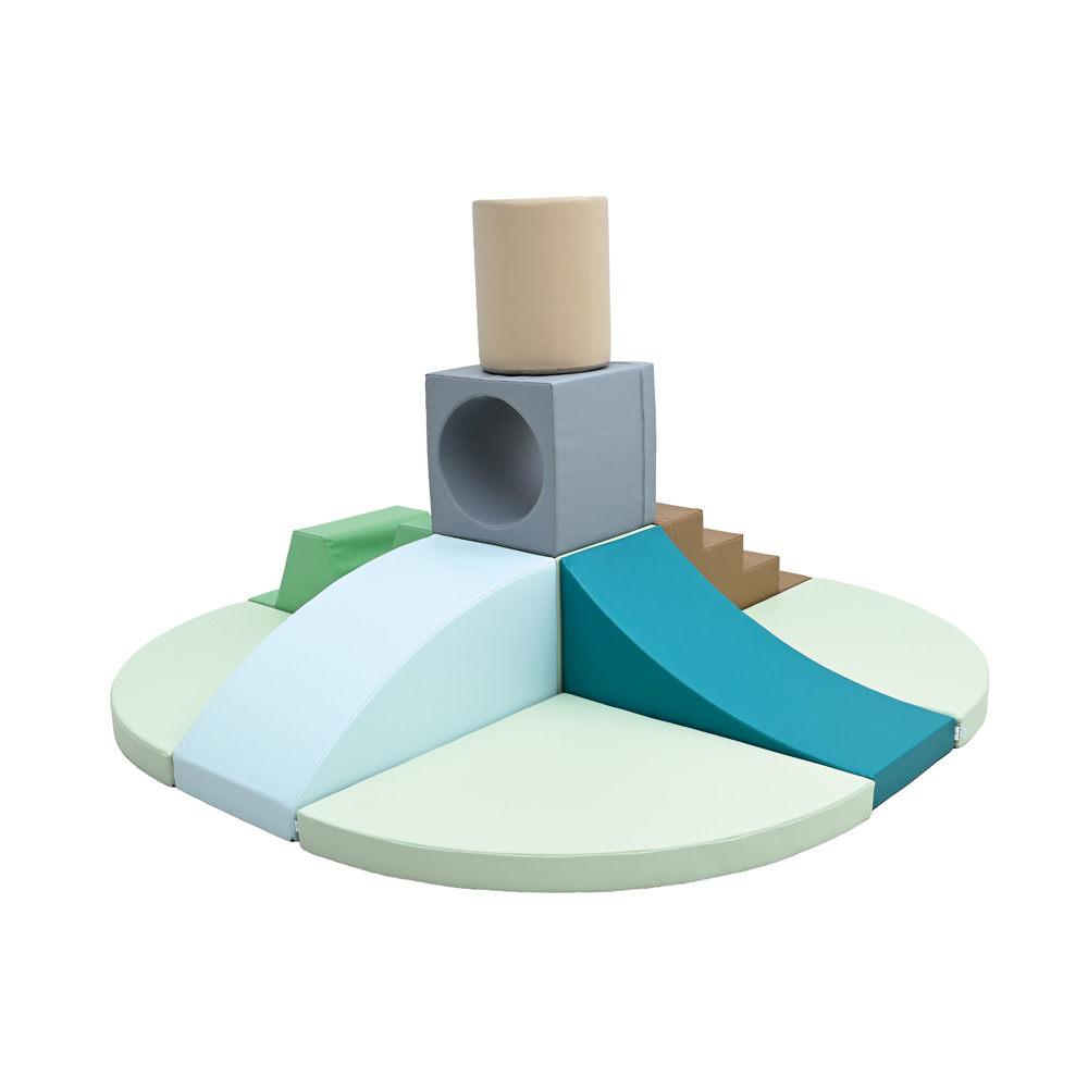 11 Schaumstoffteile, aus denen eine Hindernisstrecke oder eine Spielinsel entsteht. Mit einem Loch-Würfel als Tunnelelement.