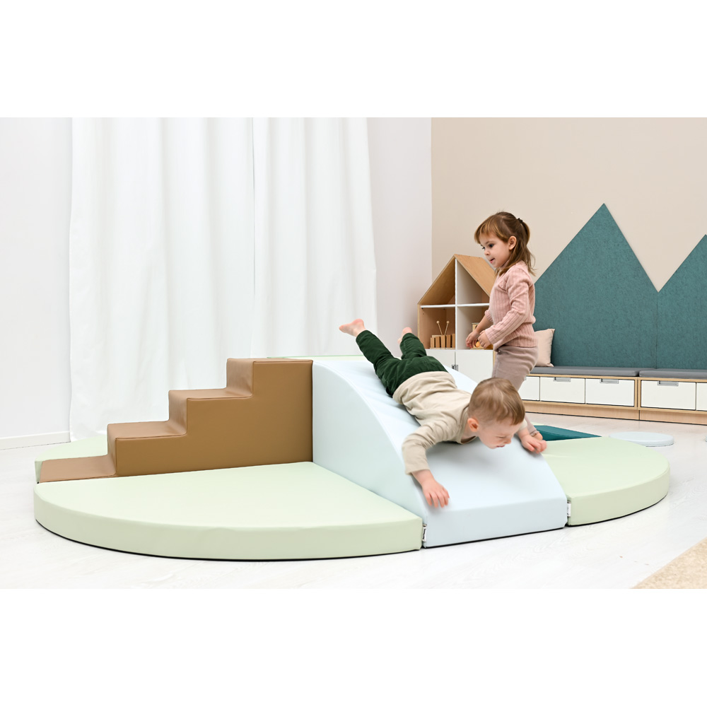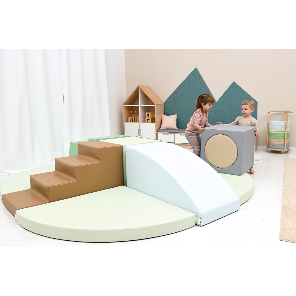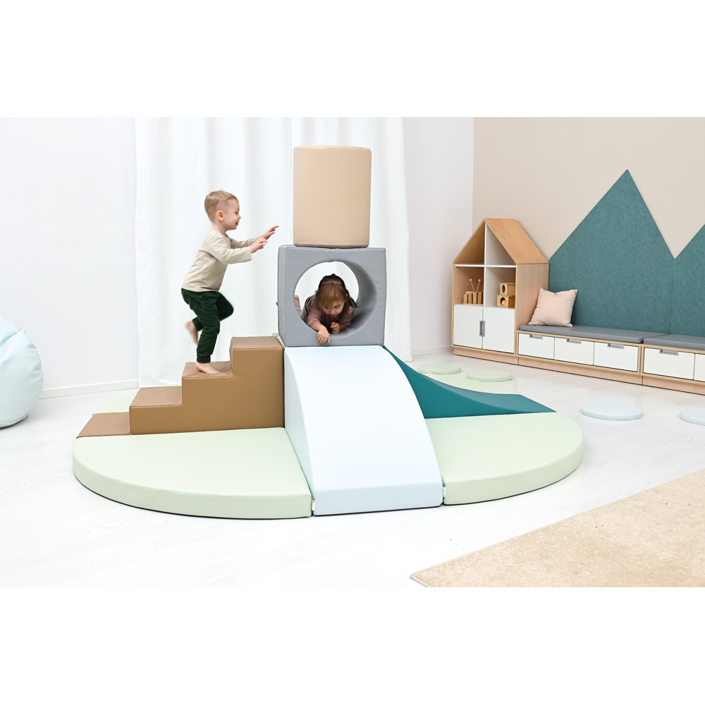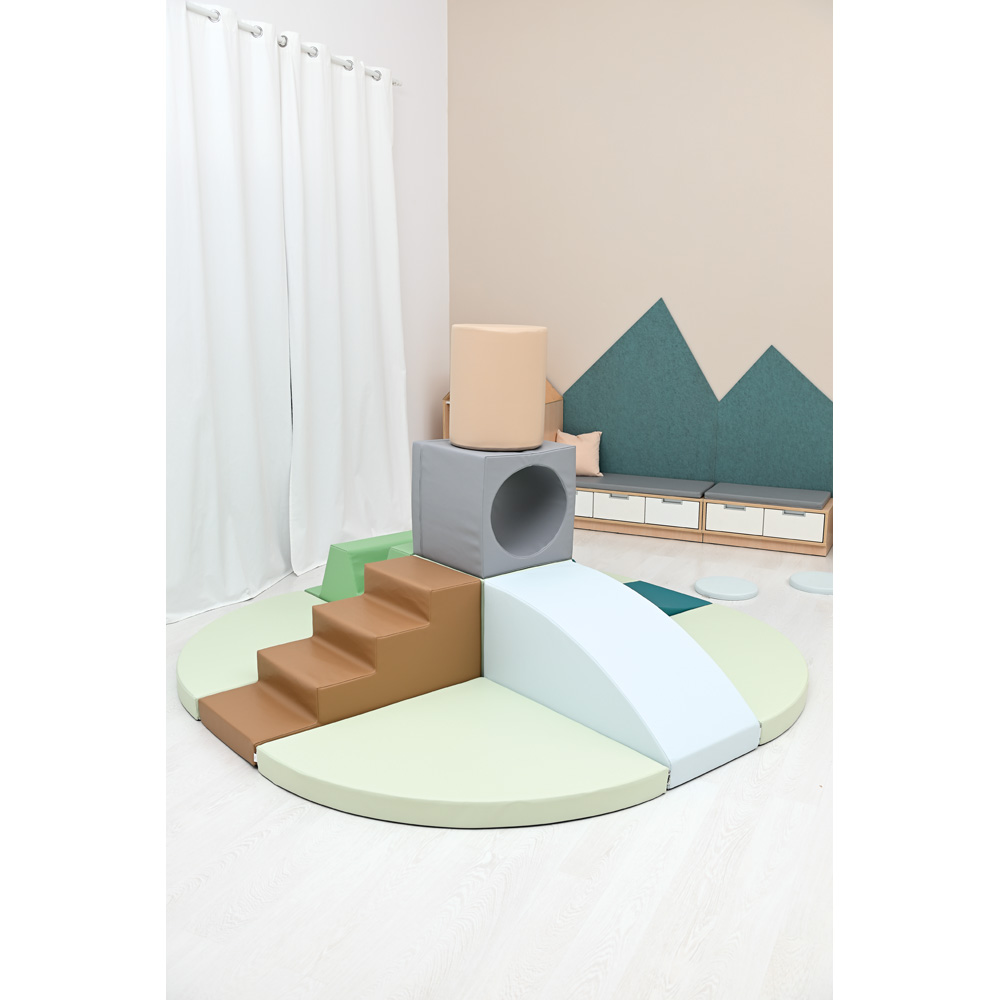 11 Schaumstoffteile, aus denen eine Hindernisstrecke oder eine Spielinsel entsteht. Mit einem Loch-Würfel als Tunnelelement.