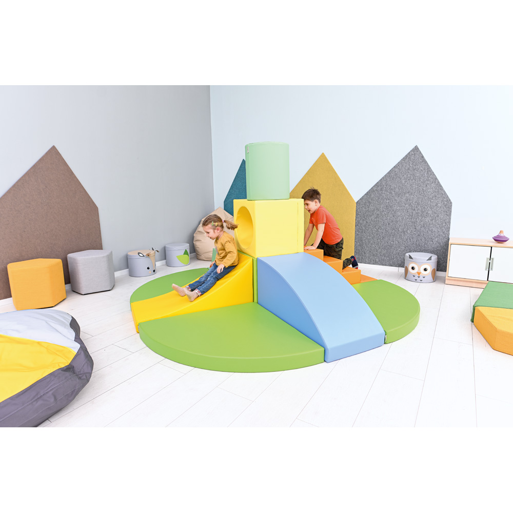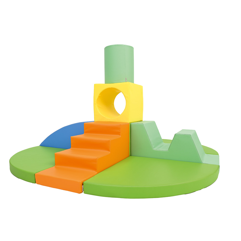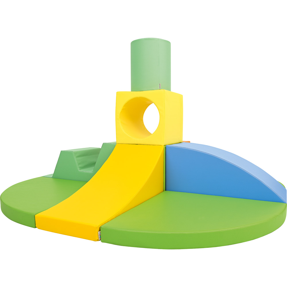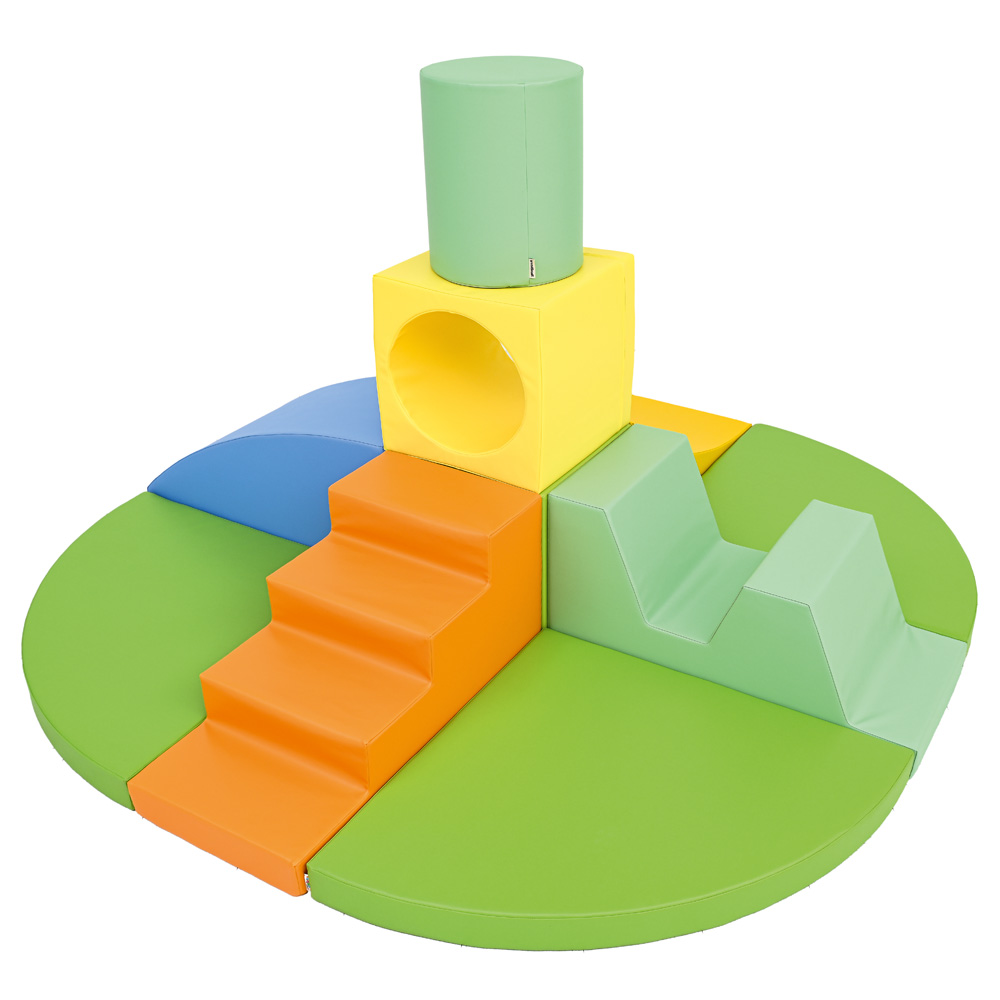Schaumstoffteile, aus denen eine Hindernisstrecke entsteht. Mit einem Loch-Würfel als Tunnelelement.