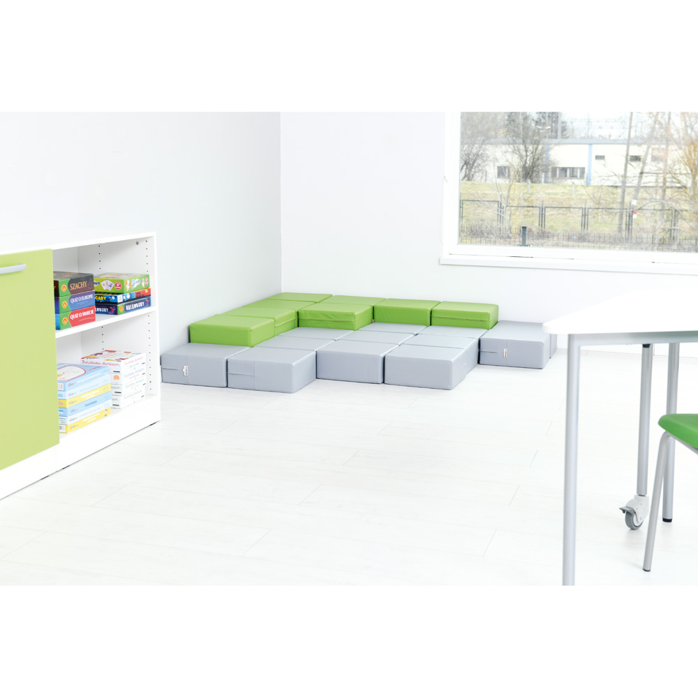 Verschiedenfarbige Schaumstoff-Sitze mit einer Grundfläche von je 35 x 35 cm und unterschiedlichen Höhen ermöglichen die Schaffung eines kleinen Erholungsplatzes. Herrliche Konstruktionsspiele oder der Bau einer Hindernisbahn fordern die Kinder auf vielen Entwicklungsebenen.
