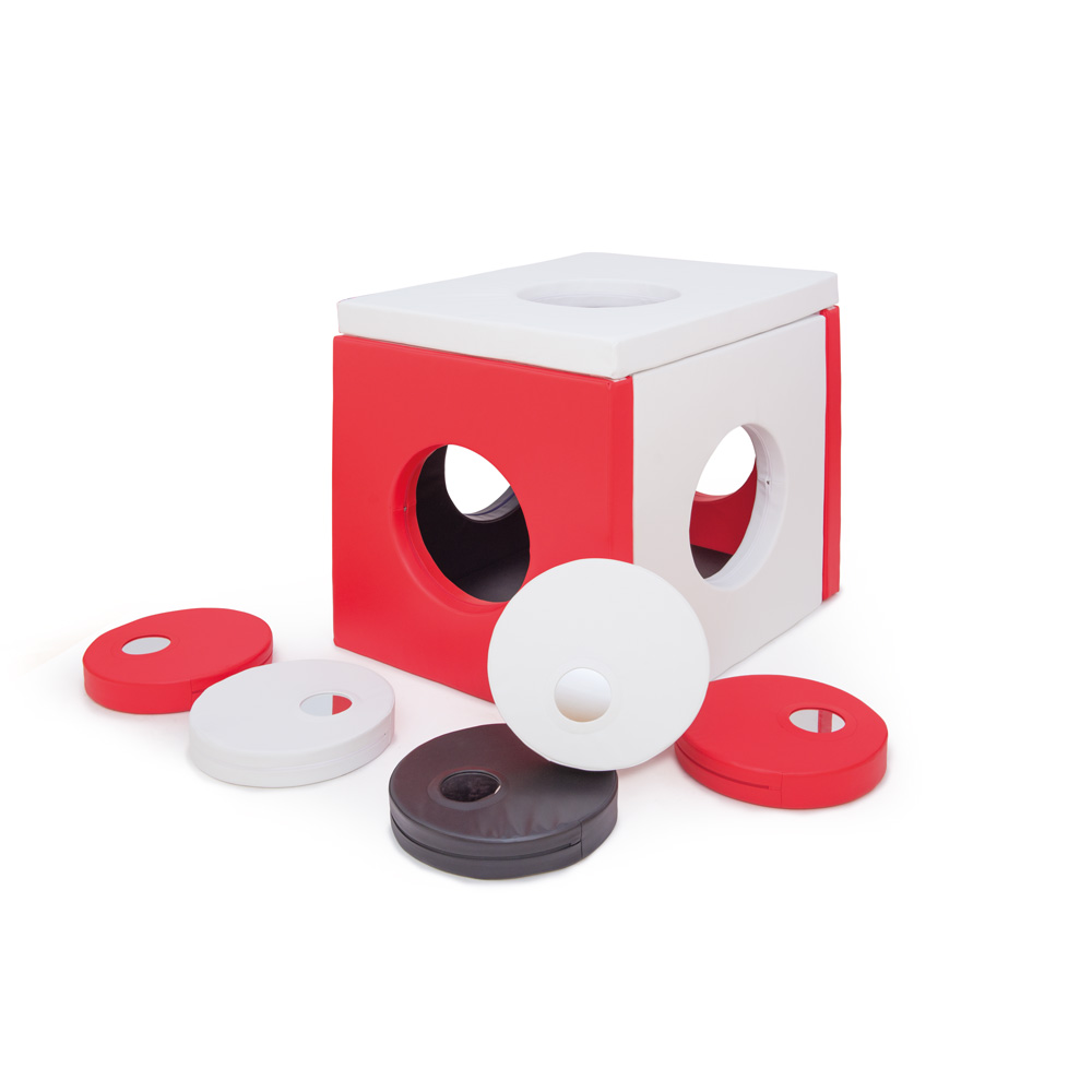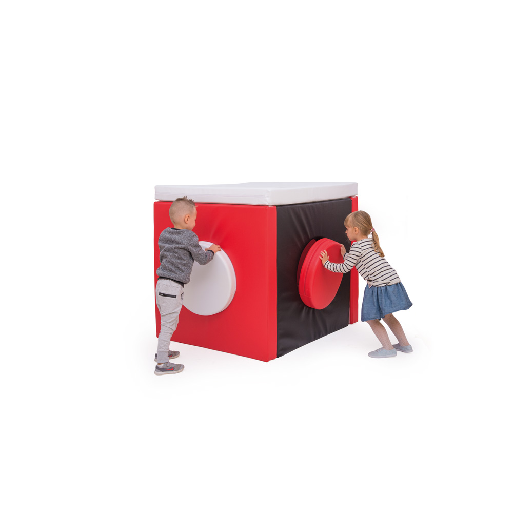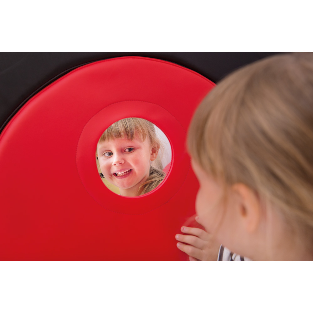 Die runden Fenster können geöffnet werden. Eine Öffnung im Dach sorgt für Luftzufuhr und ermöglicht das Anbringen kleinerer Elemente, wie Lichtleitern. Stange mit Schiebeelementen lässt sich in beliebiger Höhe anbringen, so dass auch ältere Kinder damit spielen und sich im Spiegel betrachten können.