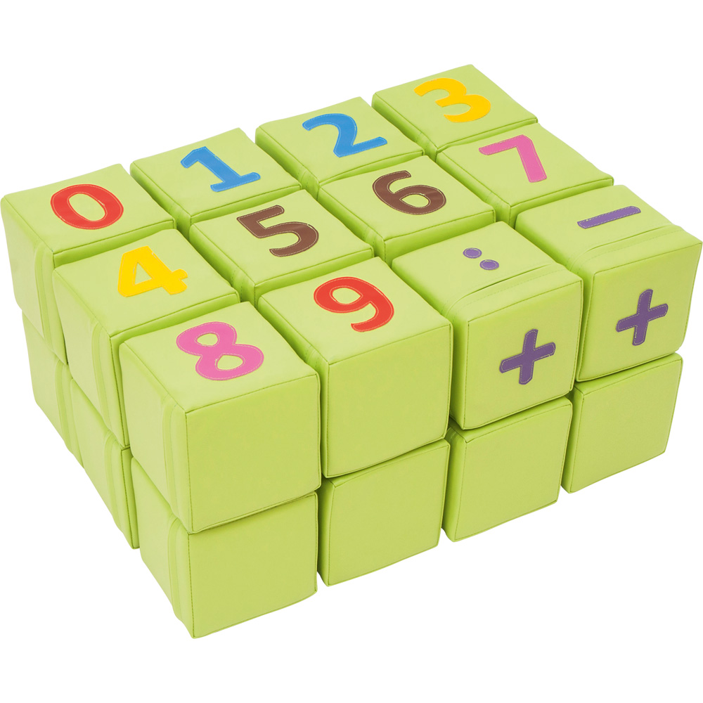 Ein Set zum spielerischen Erlernen von Zahlen. Alle Würfel sind grün, mit farbigen Zahlen und Rechenzeichen.