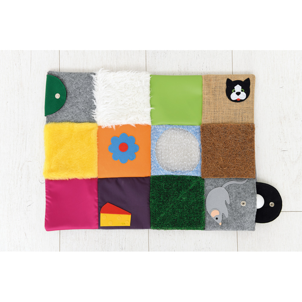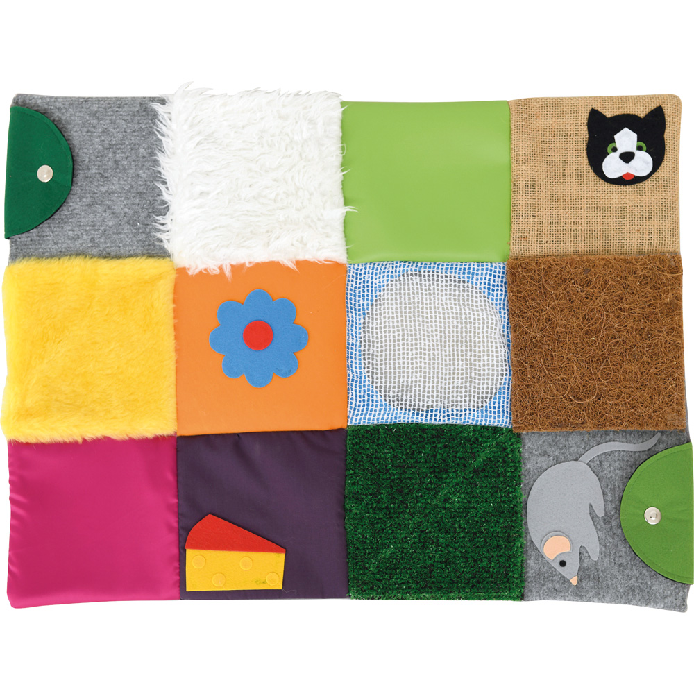 Die kleine Maus erkundet die Welt. Sie sucht nach Futter, geht auf die Wiese und trifft eine Katze. Ein kleiner Ball, der die Maus imitiert, wird durch eine Lasche ins Innere der Spielmatte gelegt, dann mit den Fingern so bewegt, dass er einen möglichst langen Weg zum Loch auf der gegenüberliegenden Seite nimmt. Die Spielmatte ist in Quadrate unterteilt und mit Applikationen versehen. Dabei können die Kinder auch Geschichten erzählen.