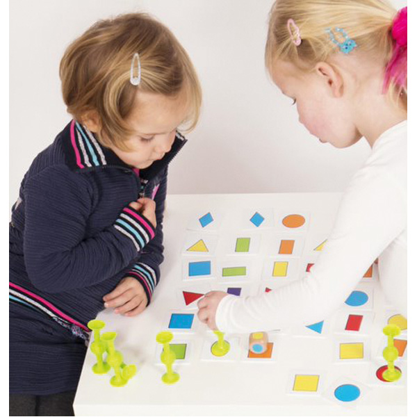 Bei dieser schönen und spannenden Kombination aus Reaktions- und Suchspiel heisst es gut beobachten und schnell reagieren. Wer findet als erster die gewürfelte Kombination aus Farbe und Form? Schnapp sie dir, indem du mit dem Fangstab ordentlich auf die Karte drückst, so dass sie am Saugnapf kleben bleibt! Jede Kombination gibt es als Karte zweimal - so wird es mitunter richtig turbulent. Jüngere Kinder können mit weniger Karten oder nur 1 Würfel spielen. Das Spiel fördert kognitive und motorische Fähigkeiten. Für 1-6 Spieler.