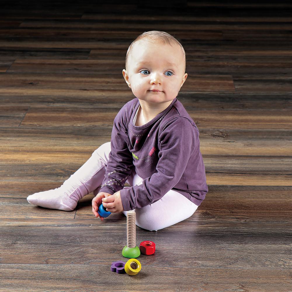 Kleine Finger und Hände werden das niedliche, bunte Schraubenspiel gar nicht mehr loslassen. Der untere Knopf ist fest mit dem Gewinde verbunden, damit die Kleinen alles gut im Griff haben. Das lila Blümchen ist zum Aufstecken. Die vier anderen Teile sind zum Auf- und Abschrauben. Bunter Spielspass ohne Ende.